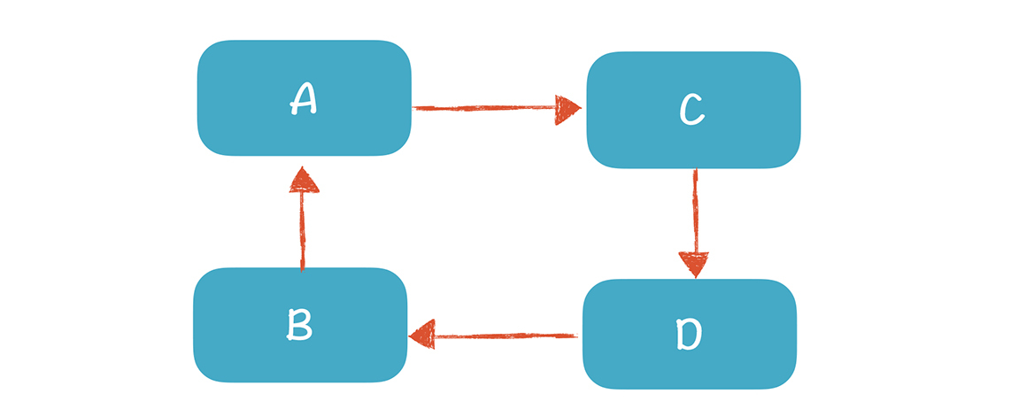 首先,是不能收集循环引用的结构。比如图中的A、B、C和D的引用计数都是1,但它们只是互相引用,没有其他变量指向它们。而循环引用在面向对象编程里很常见,比如一棵树的结构中,父节点保存了子节点的引用,子节点也保存了父节点的引用,这会让整棵树都没有办法被收集。