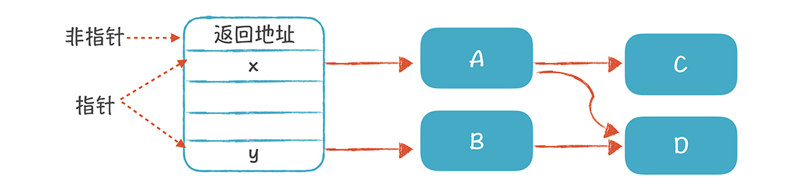 所以,所有可达的内存就不是垃圾,而计算可达性,重点在于知道哪些是根节点。在一个活动记录(栈桢)里,有些位置放的是指向堆中内存的指针,有的位置不是,比如,可能存放的是返回地址,或者是一个整数值。如果我们能够知道活动记录的布局,就可以找出所有的指针,然后就能计算寻找垃圾内存。