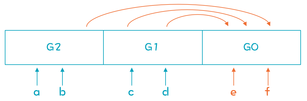 我们把堆划分成若干“代”(Generation):G0是最新代,G1就要老一些。不过GC根节点的计算有一个小小的区别:在收集G0时,根节点除了全局变量、栈和寄存器中的变量外,还要包含老一代的对象中指向G0的指针(下图中橙色的线,都是指向G0中对象的)。