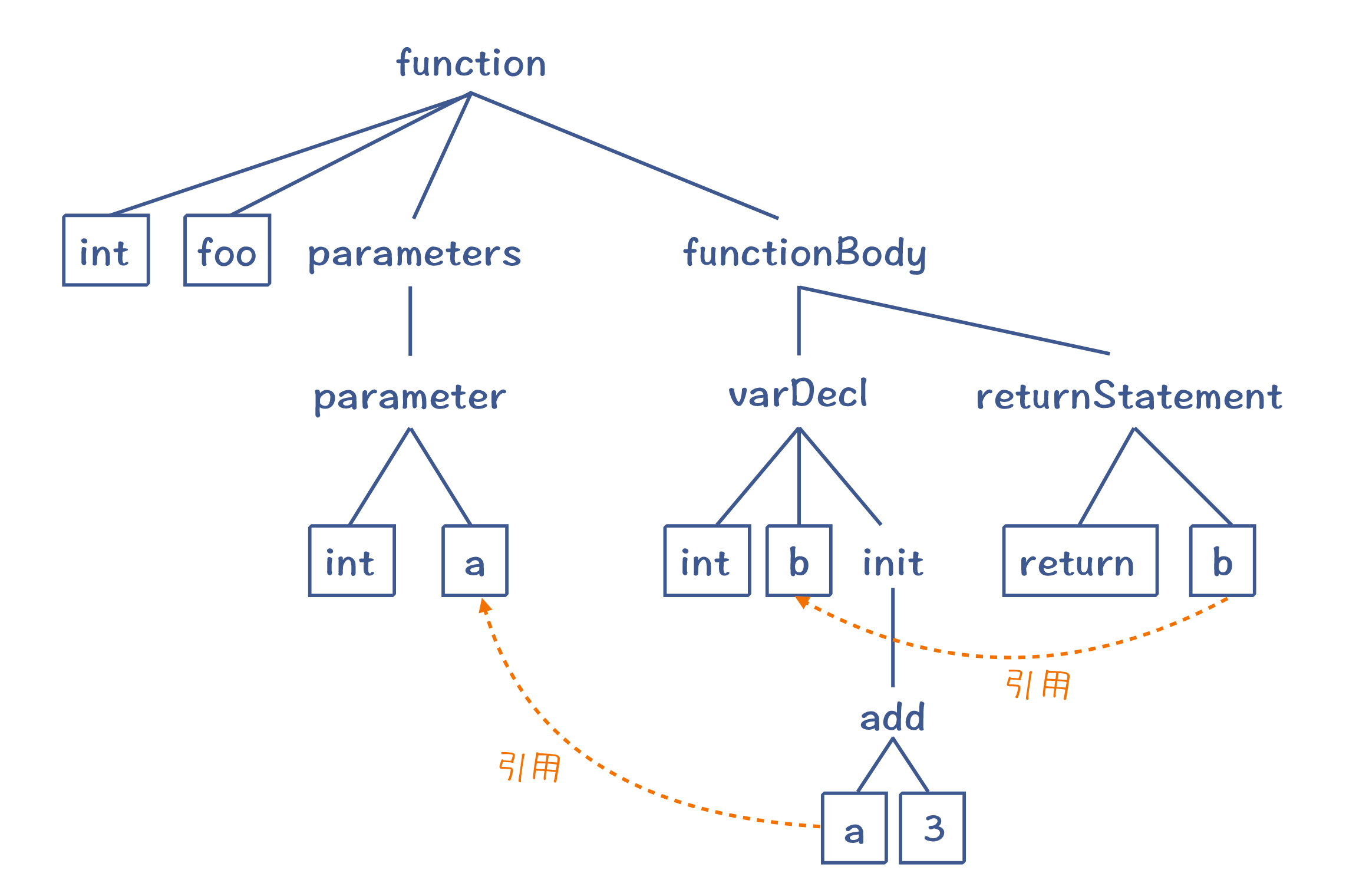 那针对引用消解,其实就是从符号表里查找被引用的符号的定义,如下图所示:
