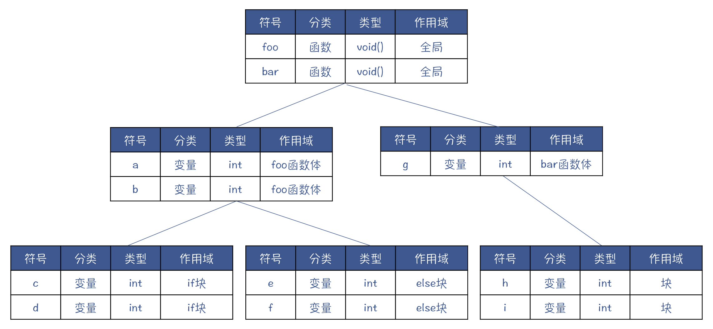 它的符号表可能是下面这样的,分成了多个层次,每个层次对应了一个作用域。在全局作用域,符号表里包含foo和bar两个函数。在foo函数体里,有两个变量a和b,还有两个内部块,每个块里各有两个变量。