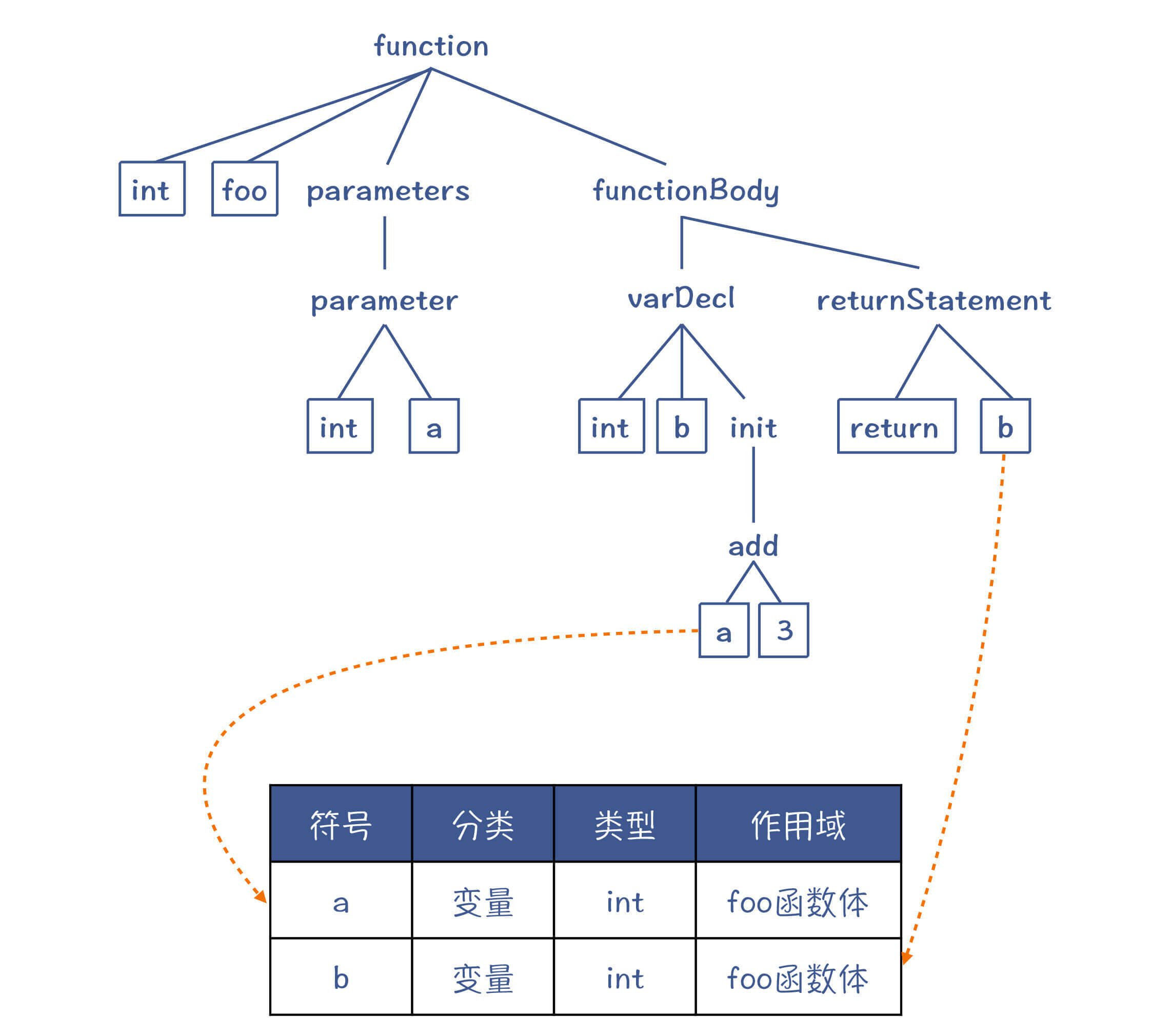 在语义分析过程中,会使用两个数据结构。一个还是AST,但我们会把语义分析时获得的一些信息标注在AST上,形成带有标注的AST。另一个是符号表,用来记录程序中声明的各种标识符,并用于后续各个编译阶段。