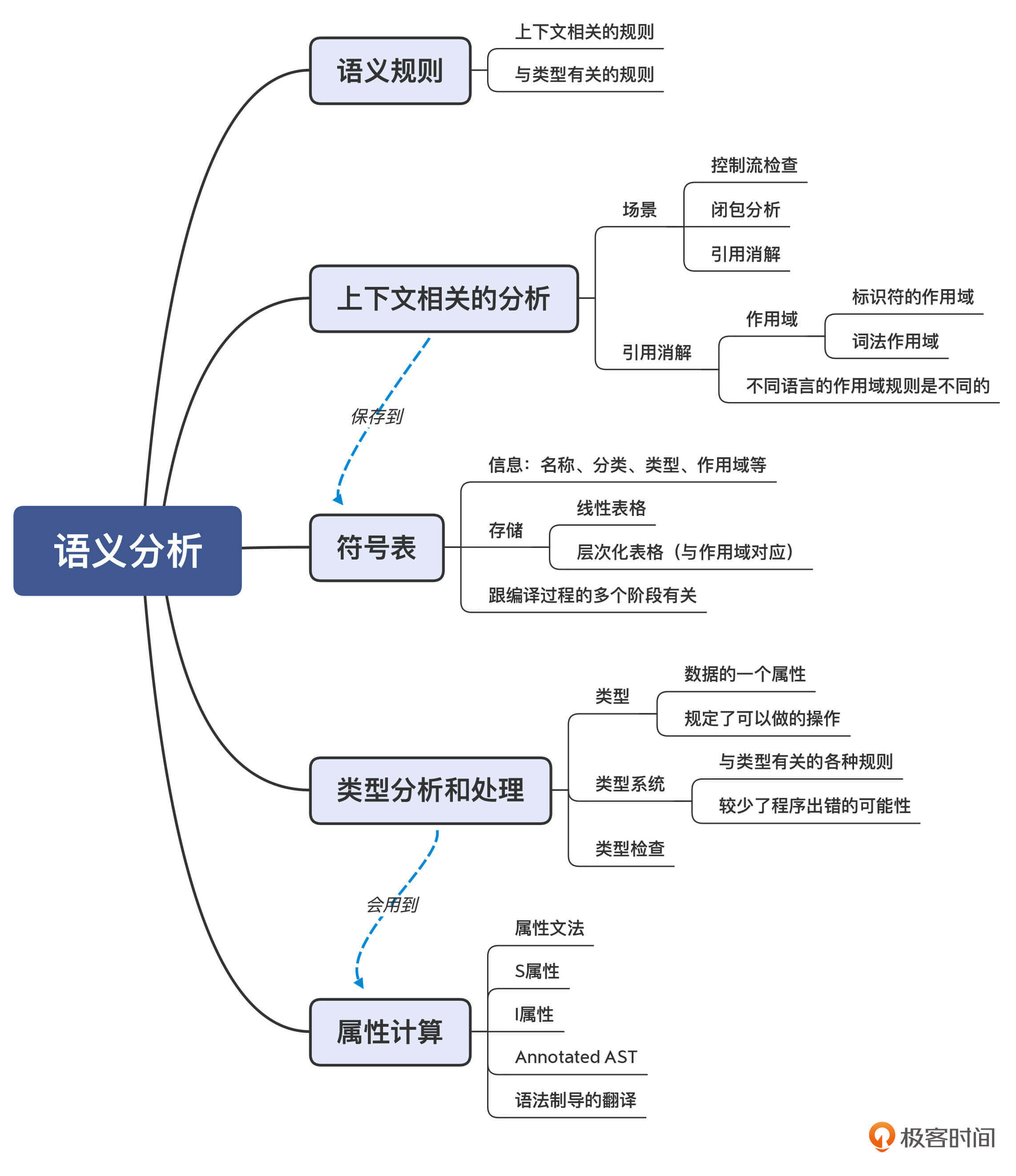 第二类规则与类型有关。在计算机语言中,类型是语义的重要载体。所以,语义分析阶段要处理与类型有关的工作。比如,声明新类型、类型检查、类型推断等。在做类型分析的时候,我们会用到一个工具,就是属性计算,也是需要你了解和掌握的。