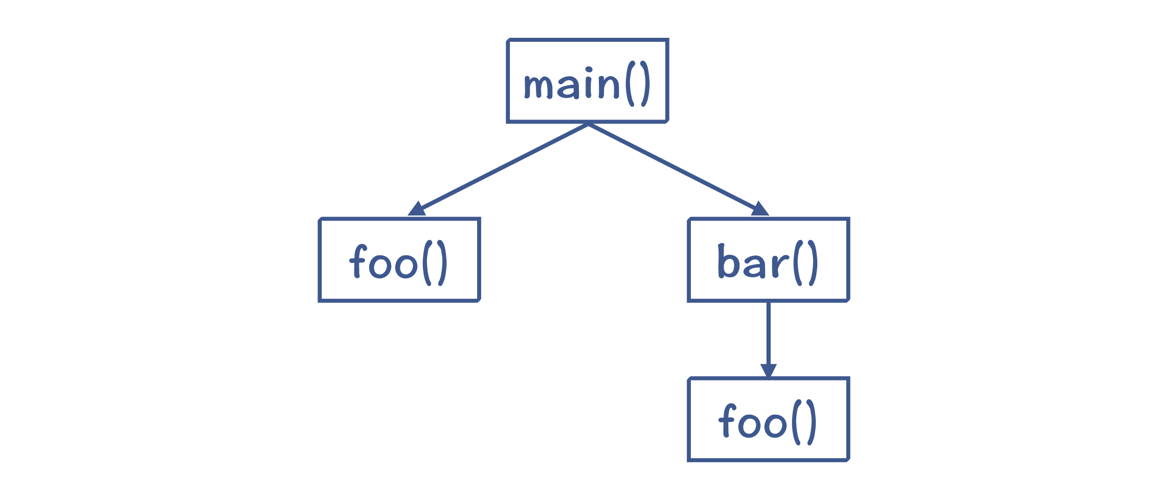 在程序里使用栈的场景是这样的,程序的运行可以看做是在逐级调用函数(或者叫过程)。像下面的示例程序,存在着main->bar->foo的调用结构,这也就是控制流转移的过程。