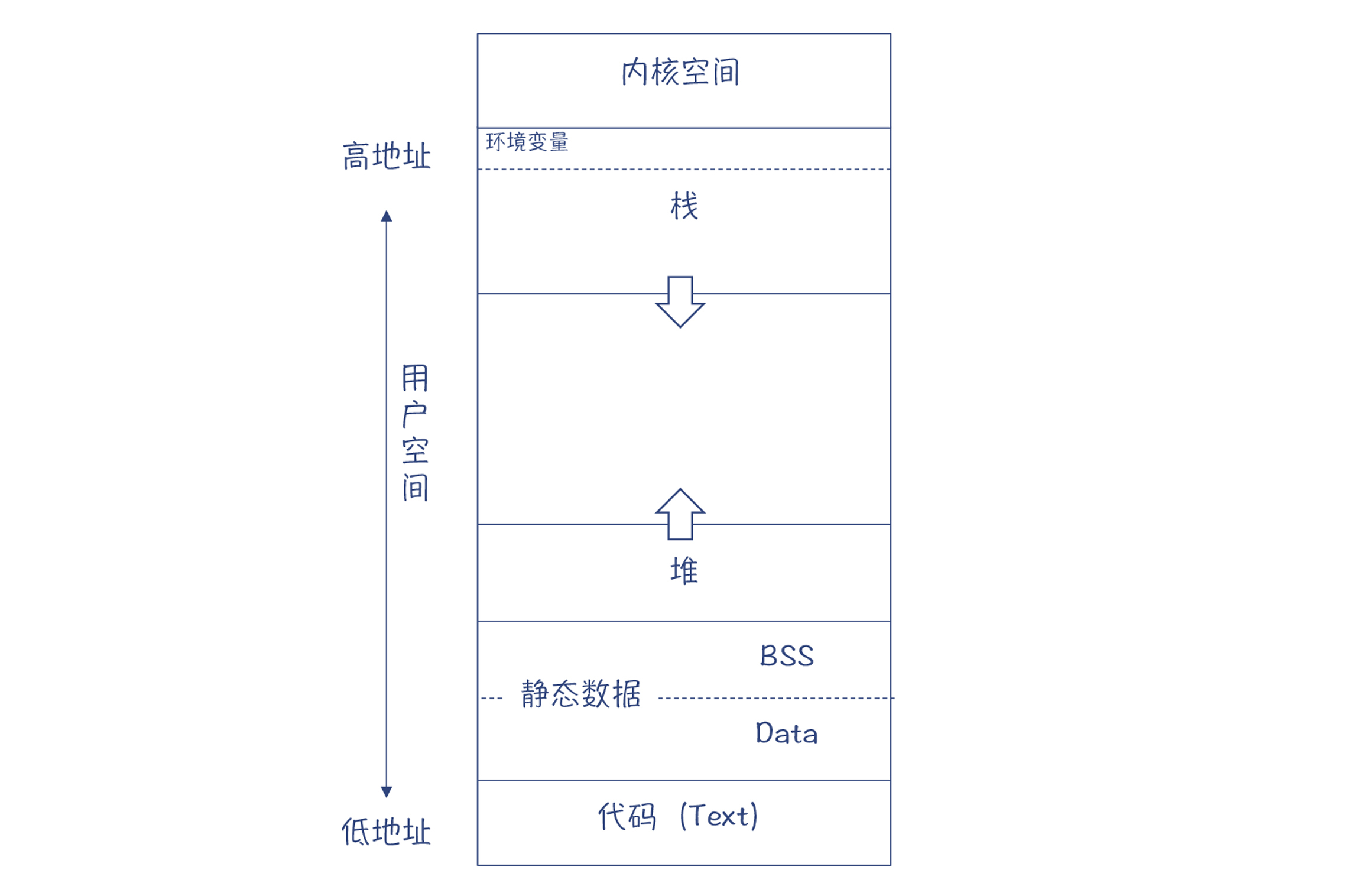 不过尽管如此,大多数语言还是会采用一些通用的内存管理模式。以C语言为例,会把内存划分为代码区、静态数据区、栈和堆,如下所示。