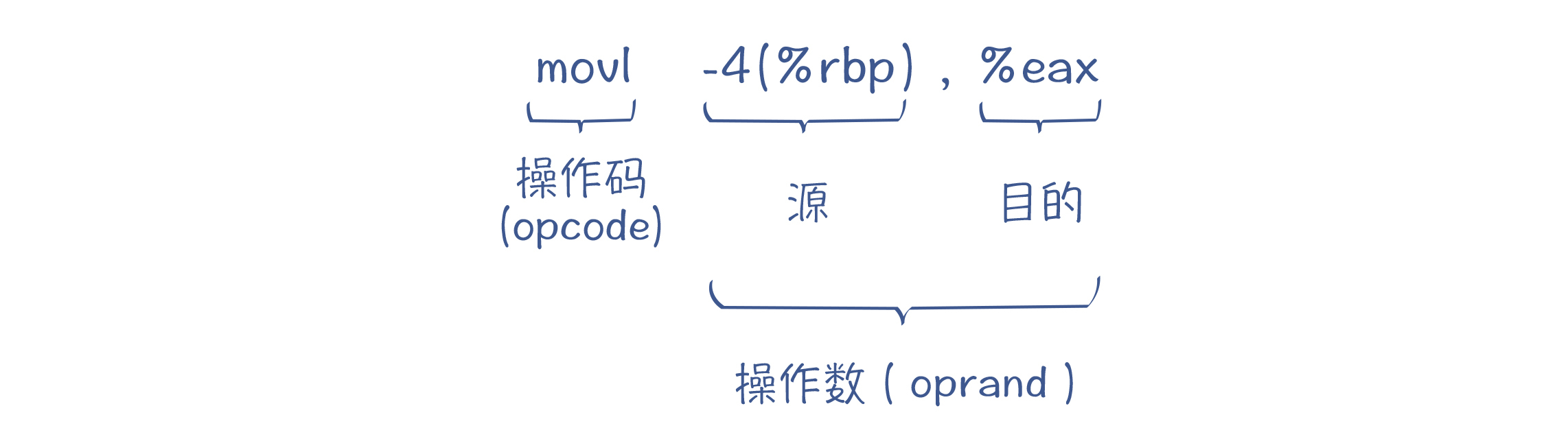 操作码是让CPU执行的动作。这段示例代码中,movl、addl是助记符(Assembly Mnemonic),其中的mov和add是指令,l是后缀,表示操作数的位数。