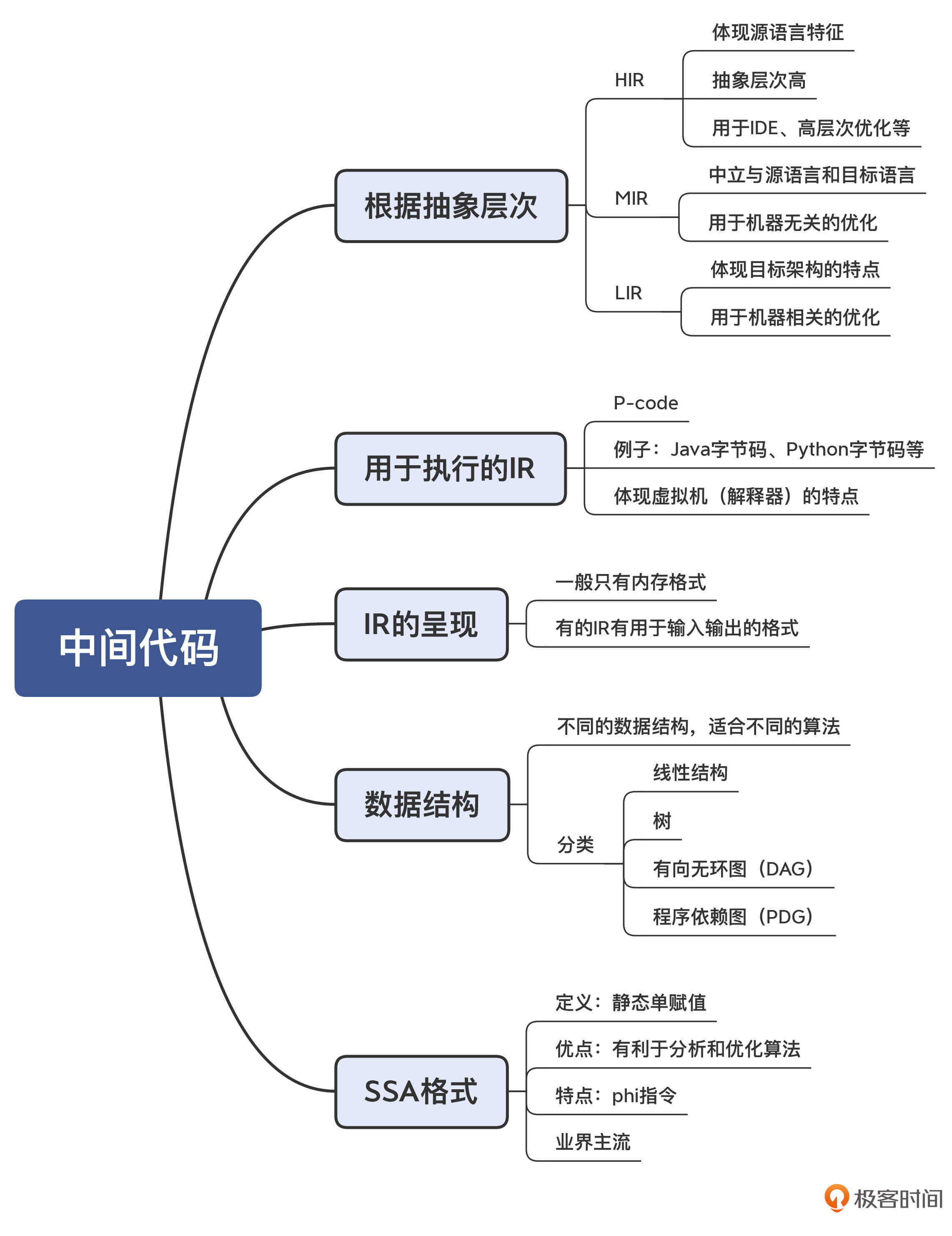 好了,通过了解IR的不同用途,你应该会对IR的概念更清晰一些。用途不同,对IR的需求也就不同,IR的设计自然也就会不同。这跟软件设计是由需求决定的,是同一个道理。