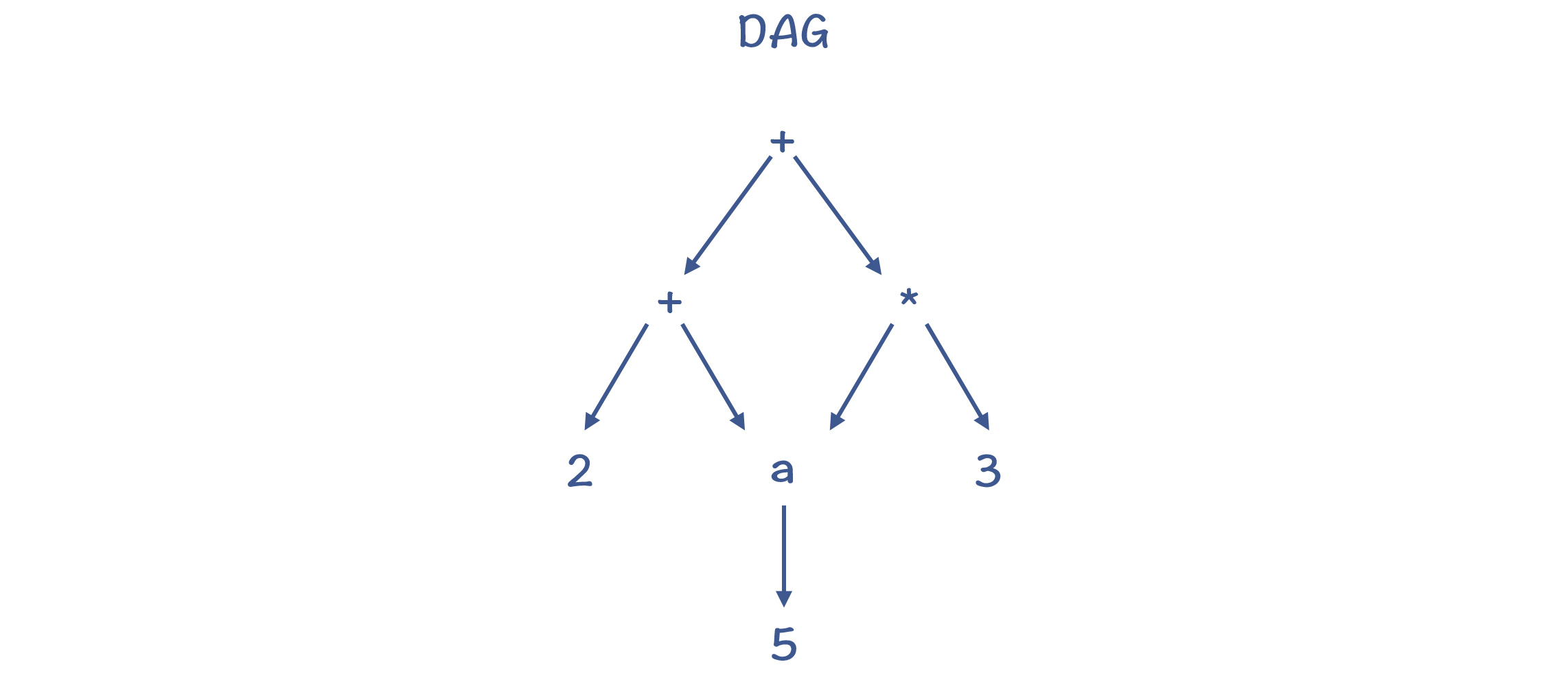 DAG结构,是在树结构的基础上,消除了冗余的子树。比如,上面的例子转化成DAG以后,对a的内存访问只做一次就行了。
