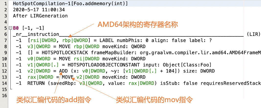 比如,下面是Java的JIT编译器输出的LIR信息,里面的指令名称已经跟汇编代码很像了,并且会直接使用AMD64架构的寄存器名称。
