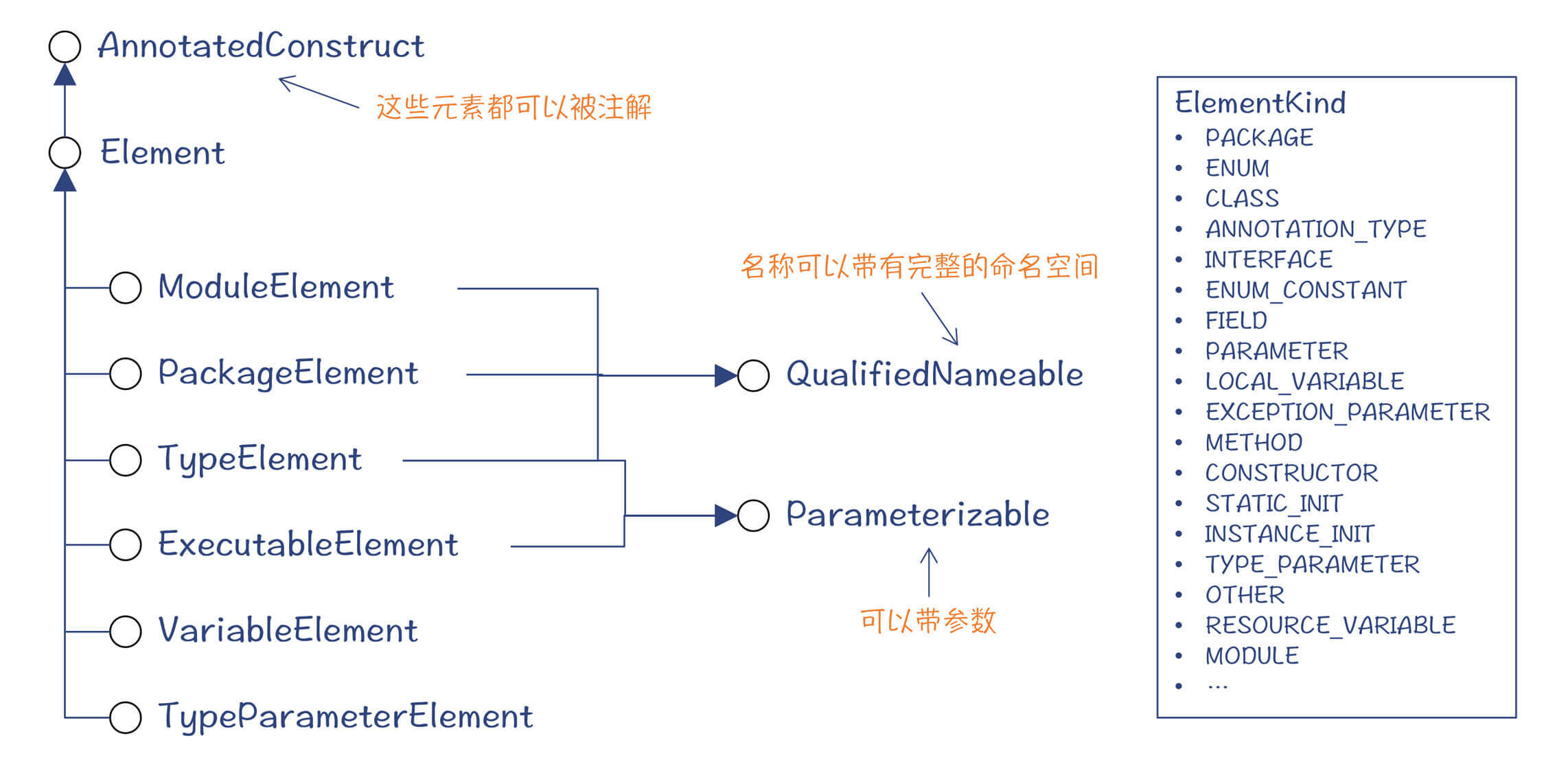其实,符号代表了一门语言的基础构成元素。在java.compiler模块中定义了Java语言的构成元素(Element),包括模块、包、类型、可执行元素、变量元素等。这其中的每个元素,都是一种符号。