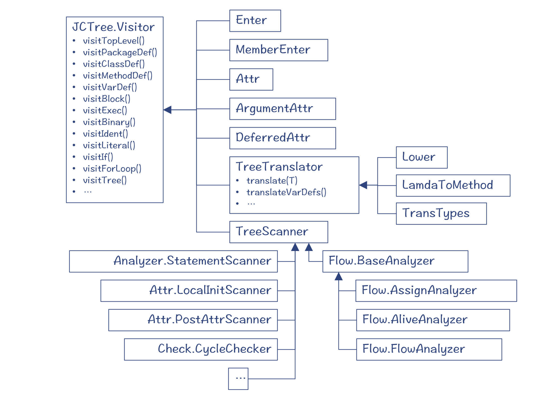 你在跟踪编译器运行的时候,可以在JCClassDecl等AST节点的sym变量上打个中断标记,这样你就会知道sym是什么时候被赋值的,从而也就了解了整个调用栈,这样会比较省事。