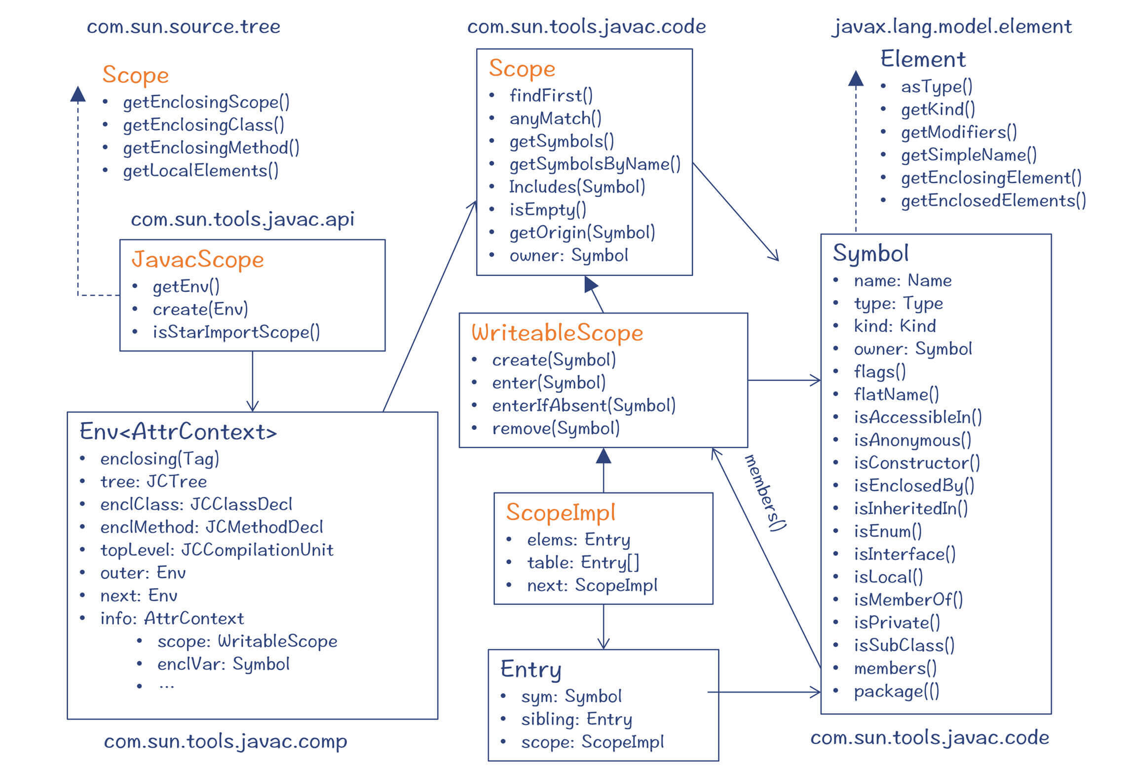首先是com.sun.tools.javac.code.Scope$ScopeImpl类:这是真正用来存放Symbol的容器类。通过next属性来指向上一级作用域,形成嵌套的树状结构。