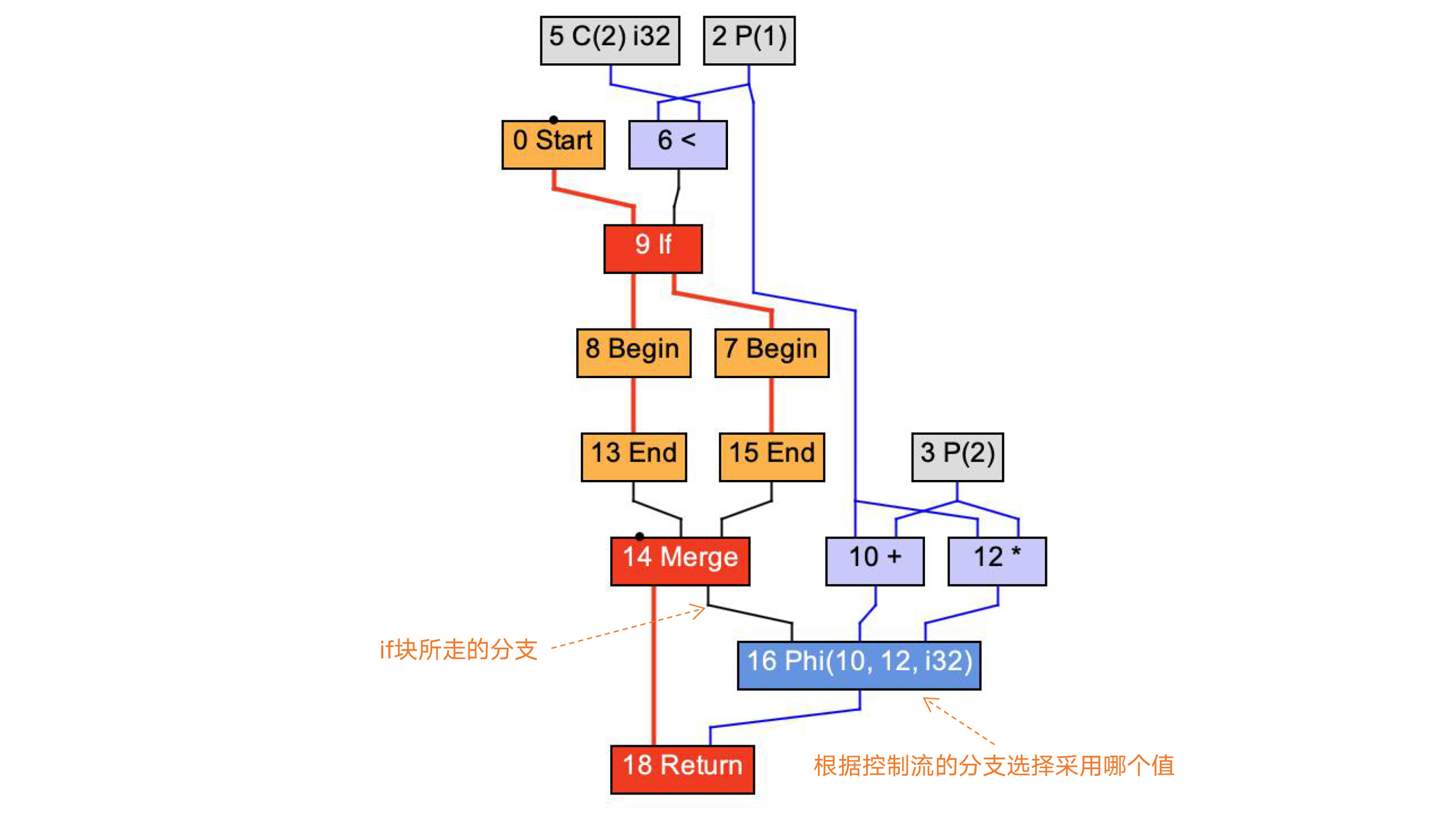 Phi节点是SSA的一个特性。在doif示例程序中,z可能有两个取值。如果控制流走的是if块,那么z=x+y;而如果走的是else块,则z=x*y。Phi节点就起到这个作用,它根据控制流来选择值。