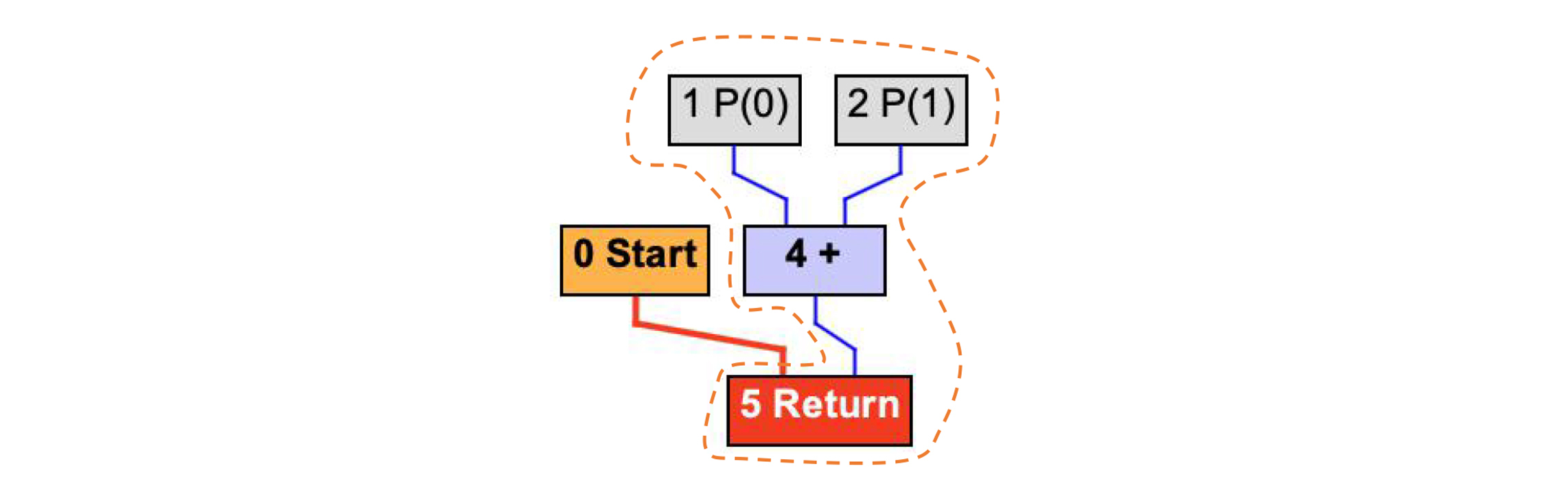 在下图中,蓝色的边代表的是数据流,也就是数据之间的依赖关系。参数1(“P(0)”节点)和参数2(“P(1)”节点)的值流入到+号节点,再流入到Return节点。