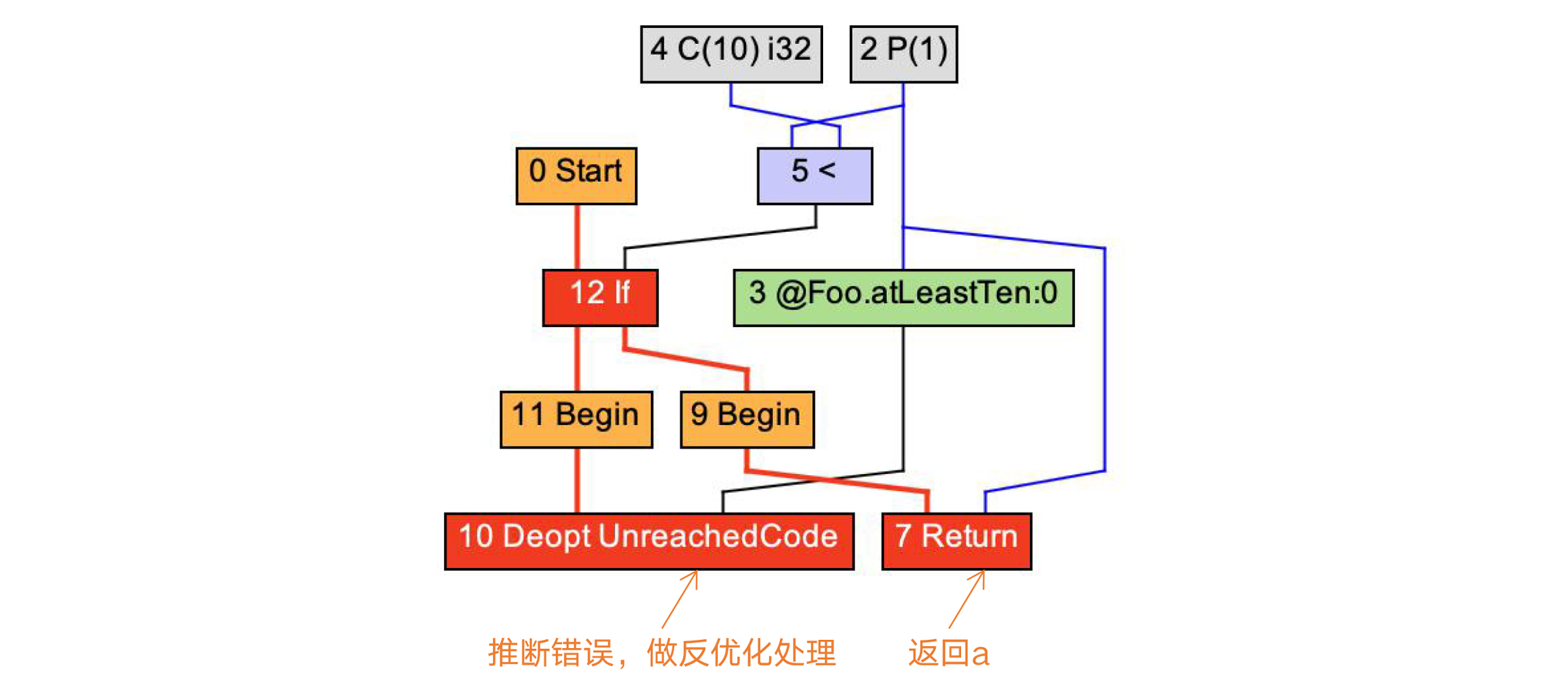 而如果遇到小于10的情况,则会导致逆优化。你会看到,IR中有一个绿色的FrameState节点,这个节点保存了栈帧的状态,在逆优化时会被用到。