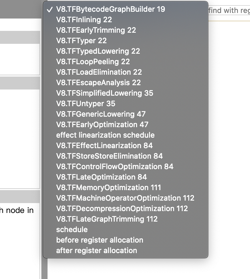 在turbolizer的界面上,还有一个下拉菜单,里面有多个优化步骤。你可以挨个点击,看看经过不同的优化步骤以后,IR的变化是什么样子的。