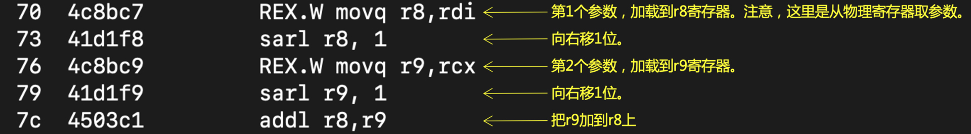 看到这里,你可能就发现了一个问题:只是做个简单的加法而已,为什么要做移位操作呢?实际上,如果你熟悉汇编语言的话,要想实现上面的功能,其实只需要下面这两行代码就可以了: