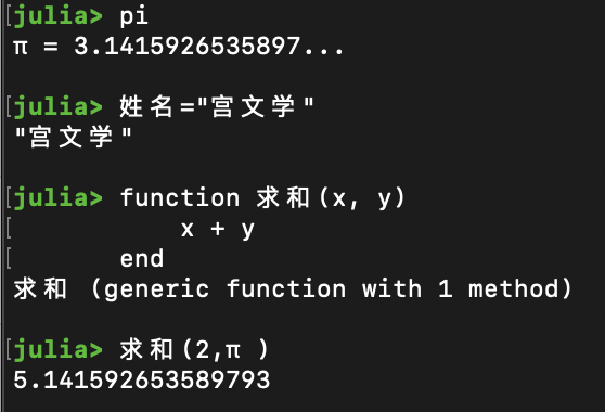 现代的大部分语言,都支持用Unicode来声明变量,甚至可以声明函数或类。这意味着什么呢?你可以用中文来声明变量和函数名称。而对于科学工作者来说,你也可以使用π、α、β、θ这些希腊字母,会更符合自己的专业习惯。下面是我在Julia中使用Unicode的情况: