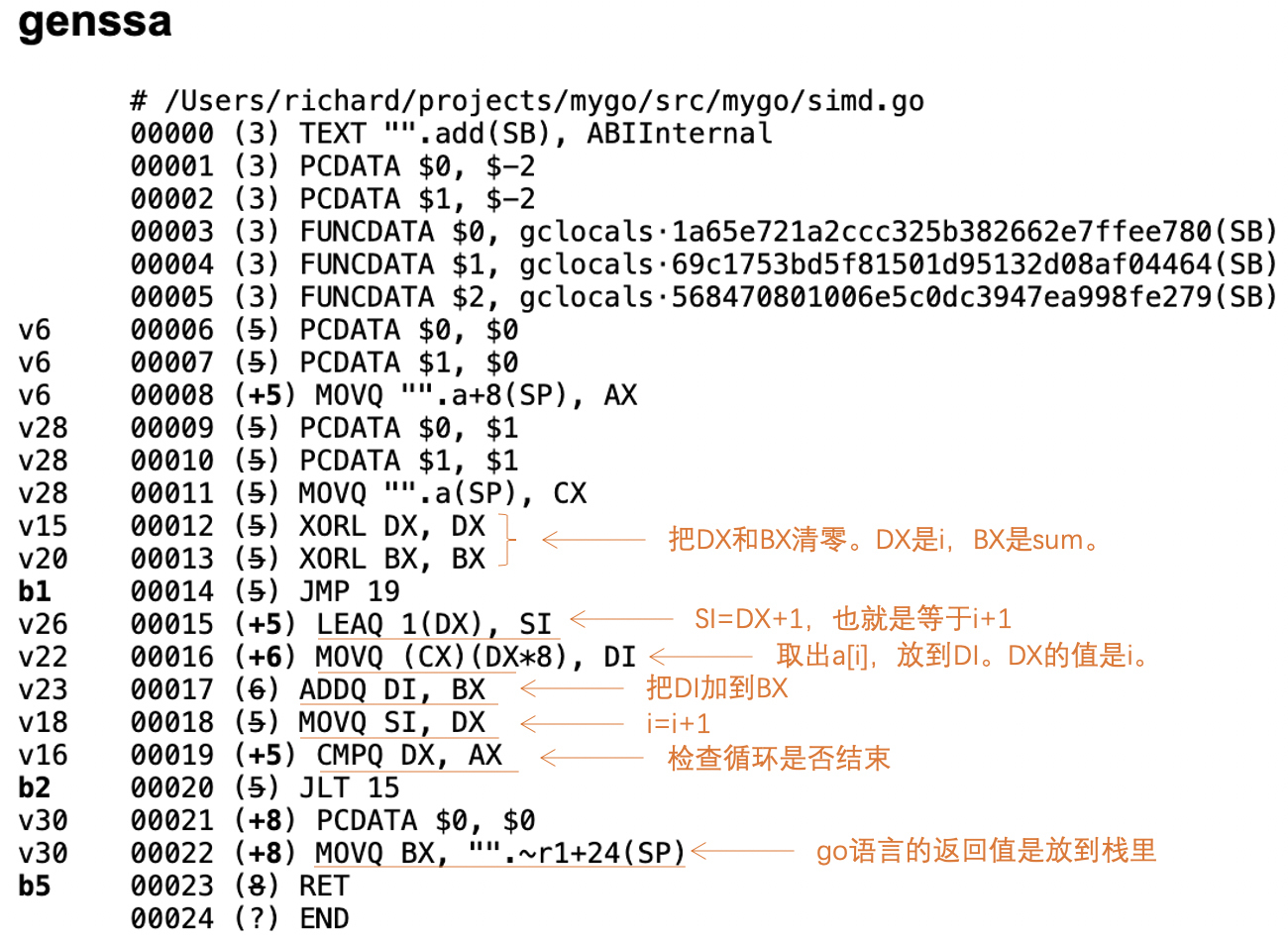 我们再来看一下Go语言的优化效果,示例代码在SIMD.go中。