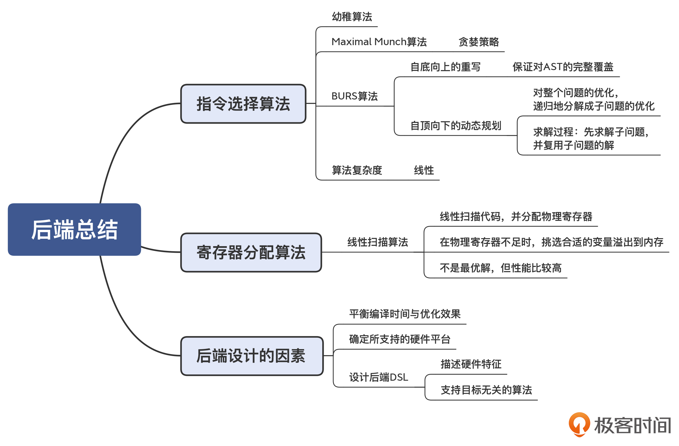 后端的工作,主要是针对各种不同架构的CPU来生成机器码。在第8讲,我已经对编译器在生成代码的过程中,所做的主要工作进行了简单的概述,你现在应该对编译器的后端工作有了一个大致的了解,也知道了后端工作中的关键算法包括指令选择、寄存器分配和指令排序(又叫做指令调度)。