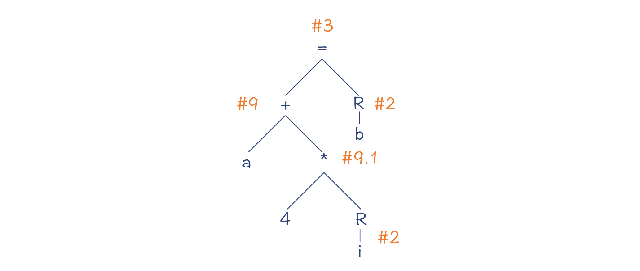 • 第2步,沿着AST继续所深度遍历,其中+号节点第1步被处理掉了,所以现在处理变量a,采用了模式#2,把变量加载到寄存器。