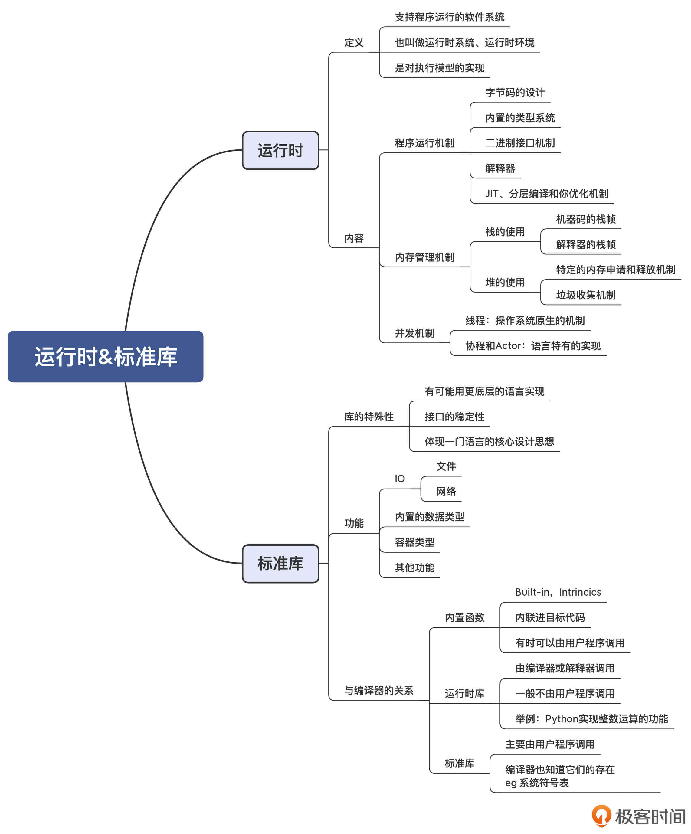 今天,我们就来探讨一下这些与运行时和标准库有关的话题。这样,你能更加充分地理解设计一门语言要完成哪些工作,以及这些工作跟编译技术又有什么关系,也就能对编译原理有更深一层的理解。