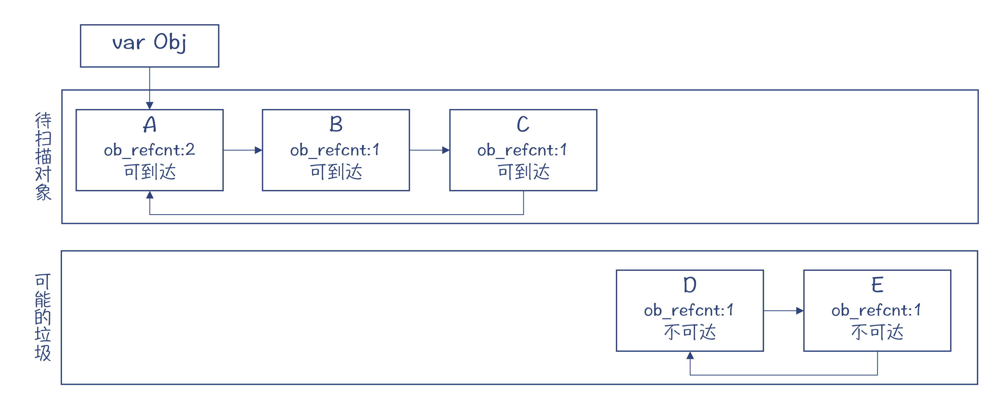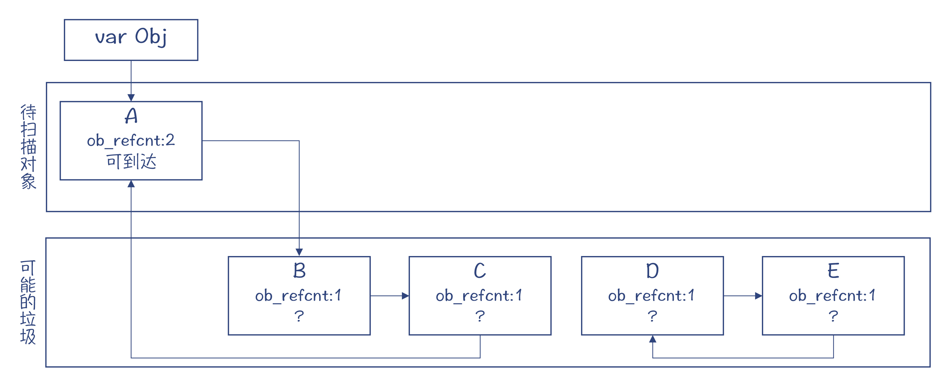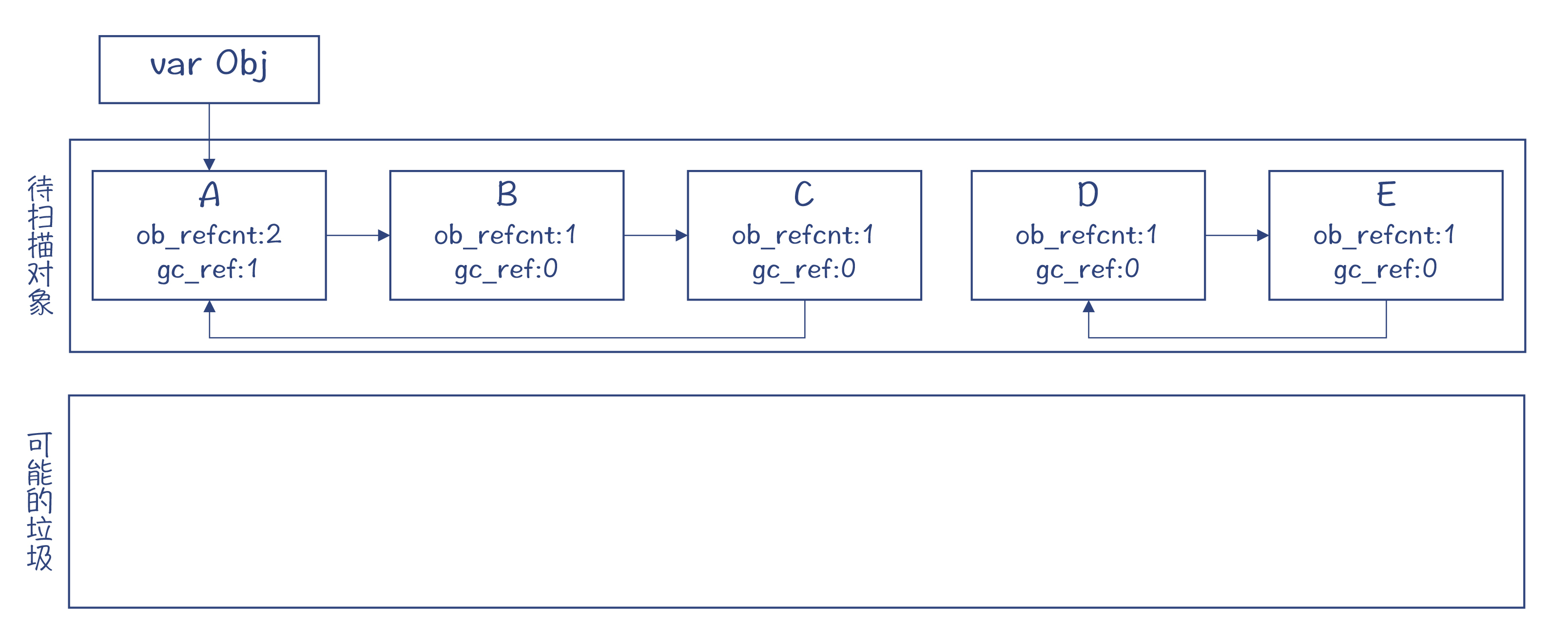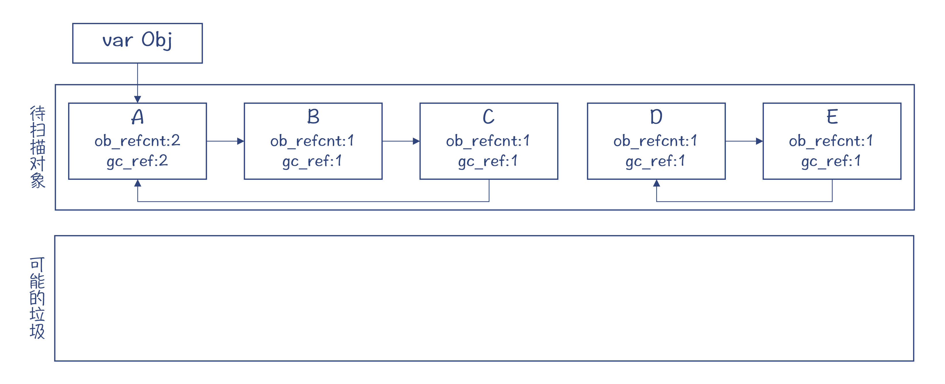 gc_ref等于零的对象,有的可能是垃圾对象,比如D和E;但也有些可能不是,比如B和C。那要怎么区分呢?我们先把这些对象都挪到另一个列表中,怀疑它们可能是垃圾。