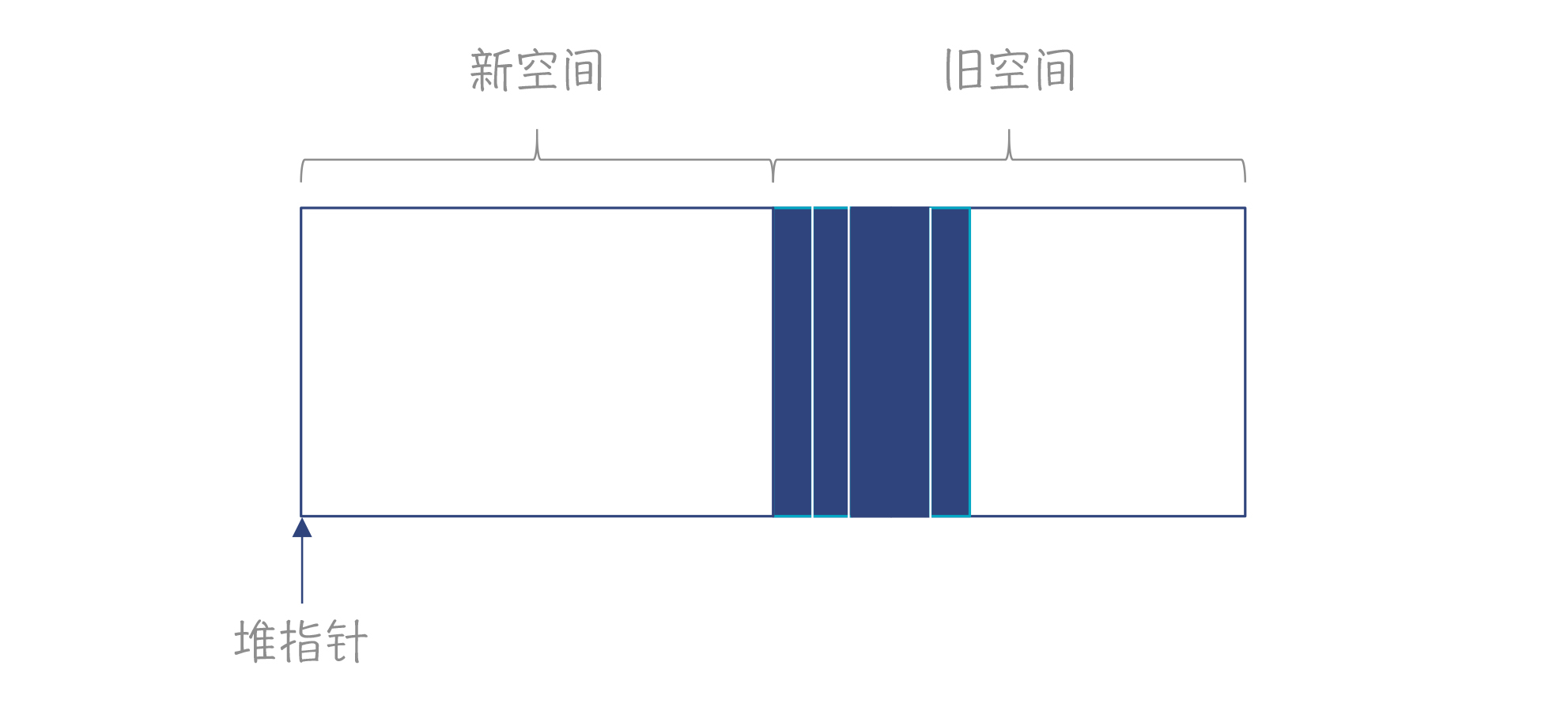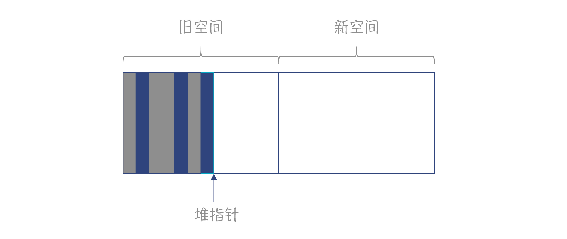 停止和拷贝算法把内存分为新旧空间两部分。你需要保持一个堆指针,指向自由空间开始的位置。申请内存时,把堆指针往右移动就行了。