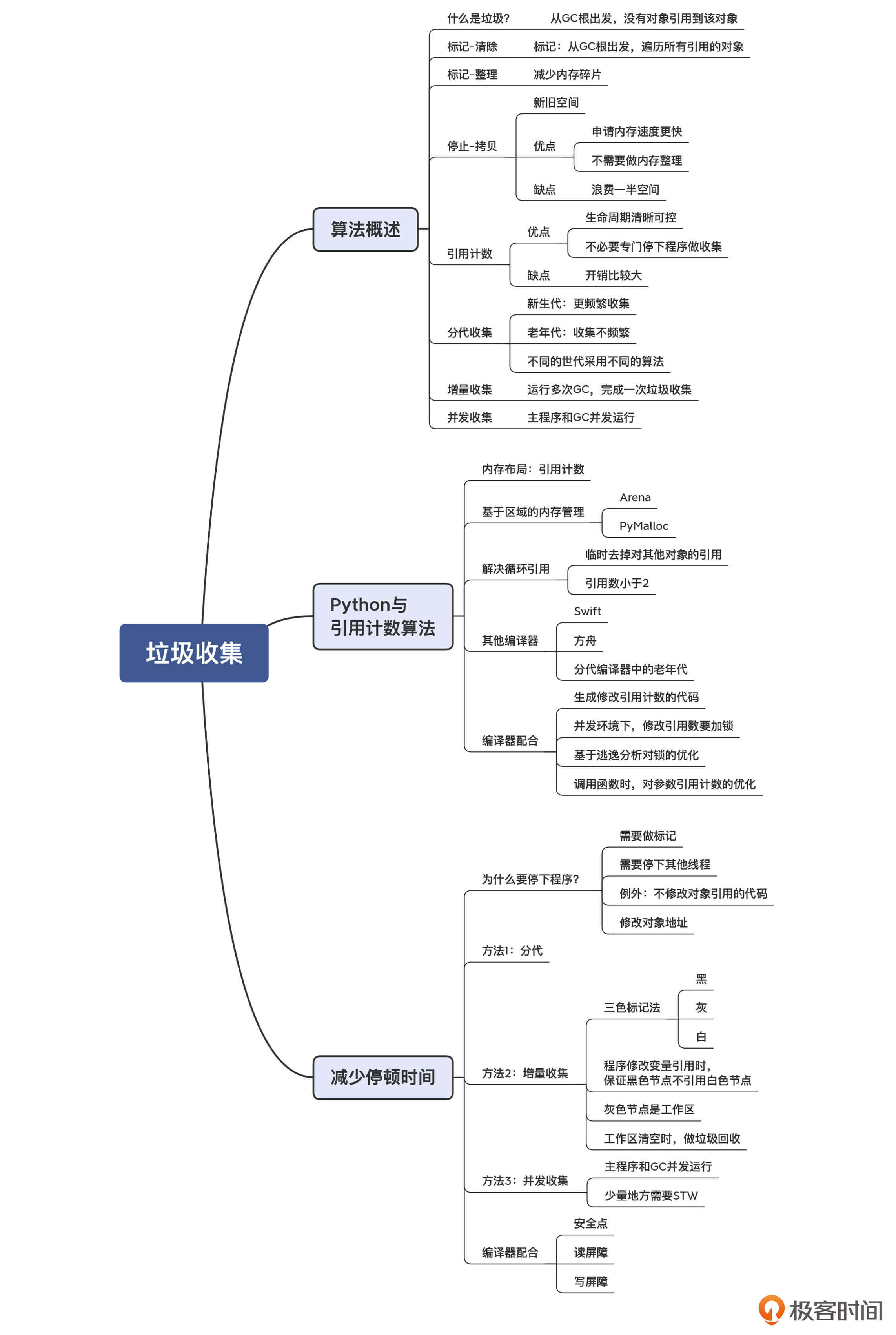 垃圾收集算法包含的内容有很多,我们这一讲并没有展开所有的内容,而是聚焦在介绍常用的几种算法(比如引用计数、分代收集、增量收集等)的原理,以及几种典型语言的编译器是如何跟选定的垃圾收集算法配合的。比如,在生成目标代码的时候,生成安全点、写屏障和读屏障的代码,修改引用数的代码,以及能够减少垃圾收集工作的一些优化工作。