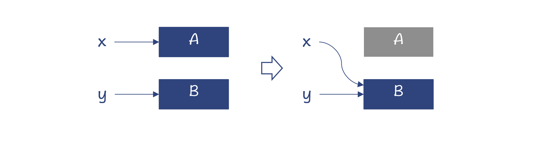 在这个算法里,我们首先让一个gc_ref变量等于对象的引用数。接着,算法假装去掉对象之间的引用。比如,去掉从A到B的引用,这使得B对象的gc_ref值变为了0。在遍历完整个列表以后,除了A对象以外,其他对象的gc_ref都变成了0。