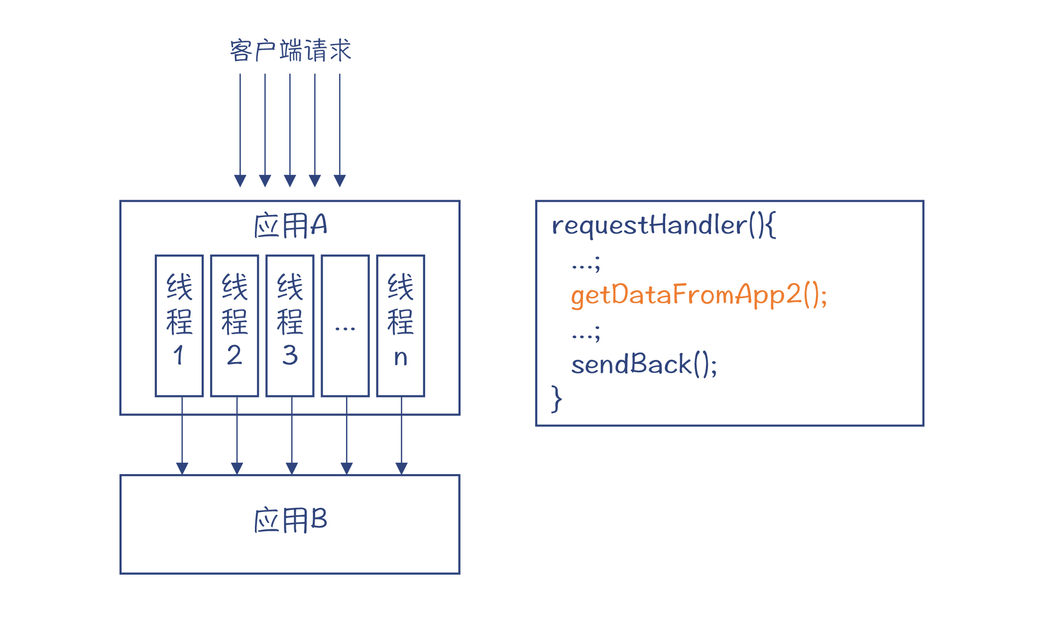假设应用A对于每一个客户端的请求,都会起一个线程做处理。而你呢,则在这个线程里发起一个针对应用B的请求。在等待网络返回结果的时候,当前线程会被阻塞住。