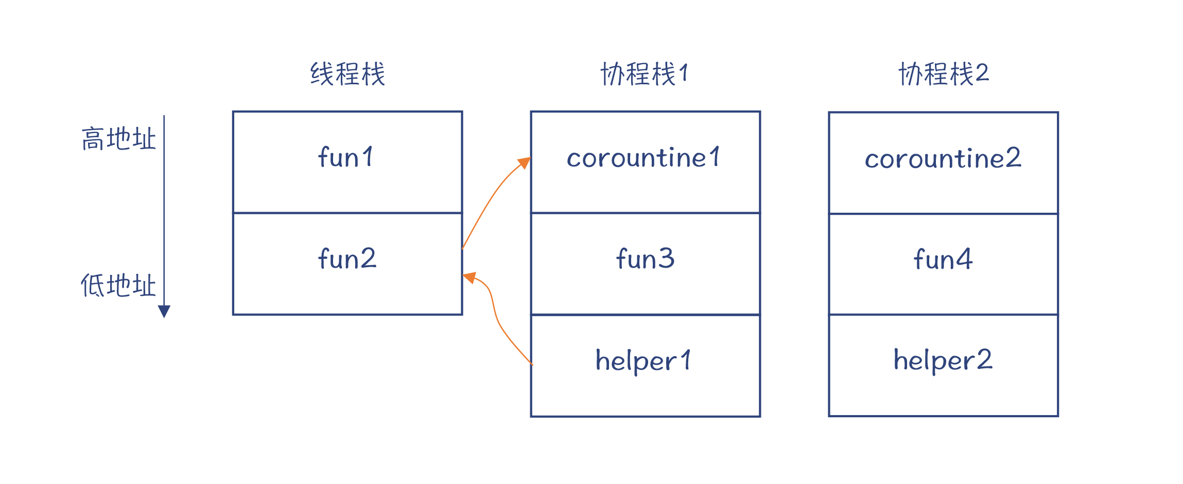 这个时候,在栈里不仅要加载helper()的活动记录,还要加载它的上一级,也就是coroutine1()的活动记录,这样才能维护正确的调用顺序。当helper()执行完毕的时候,控制流会回到coroutine1(),继续执行里面的逻辑。