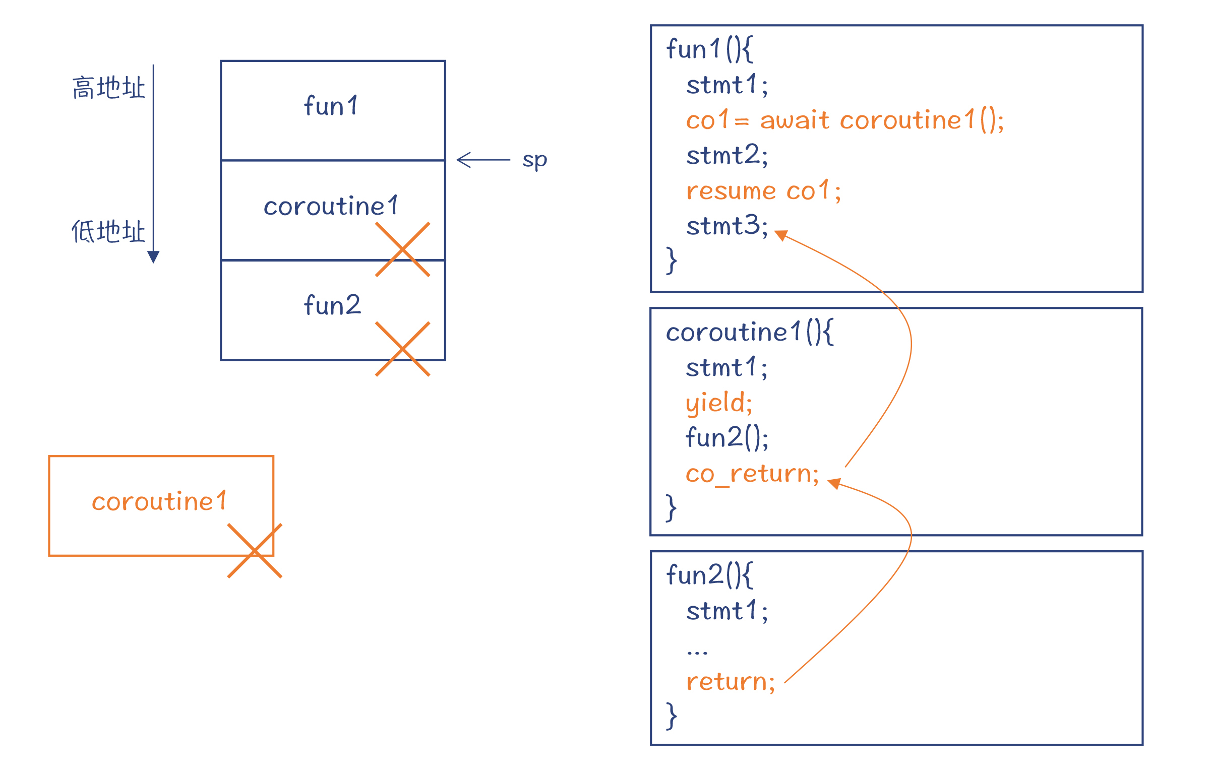 如果fun2执行完毕,那么就会返回到协程。而协程也会接着执行下一个语句,这个语句是一个专门针对协程的返回语句,我们叫它co_return吧,以便区别于传统的return。在执行了co_return以后,协程就结束了,无法再resume。这样的话,保存在堆里的活动记录也就可以销毁了。