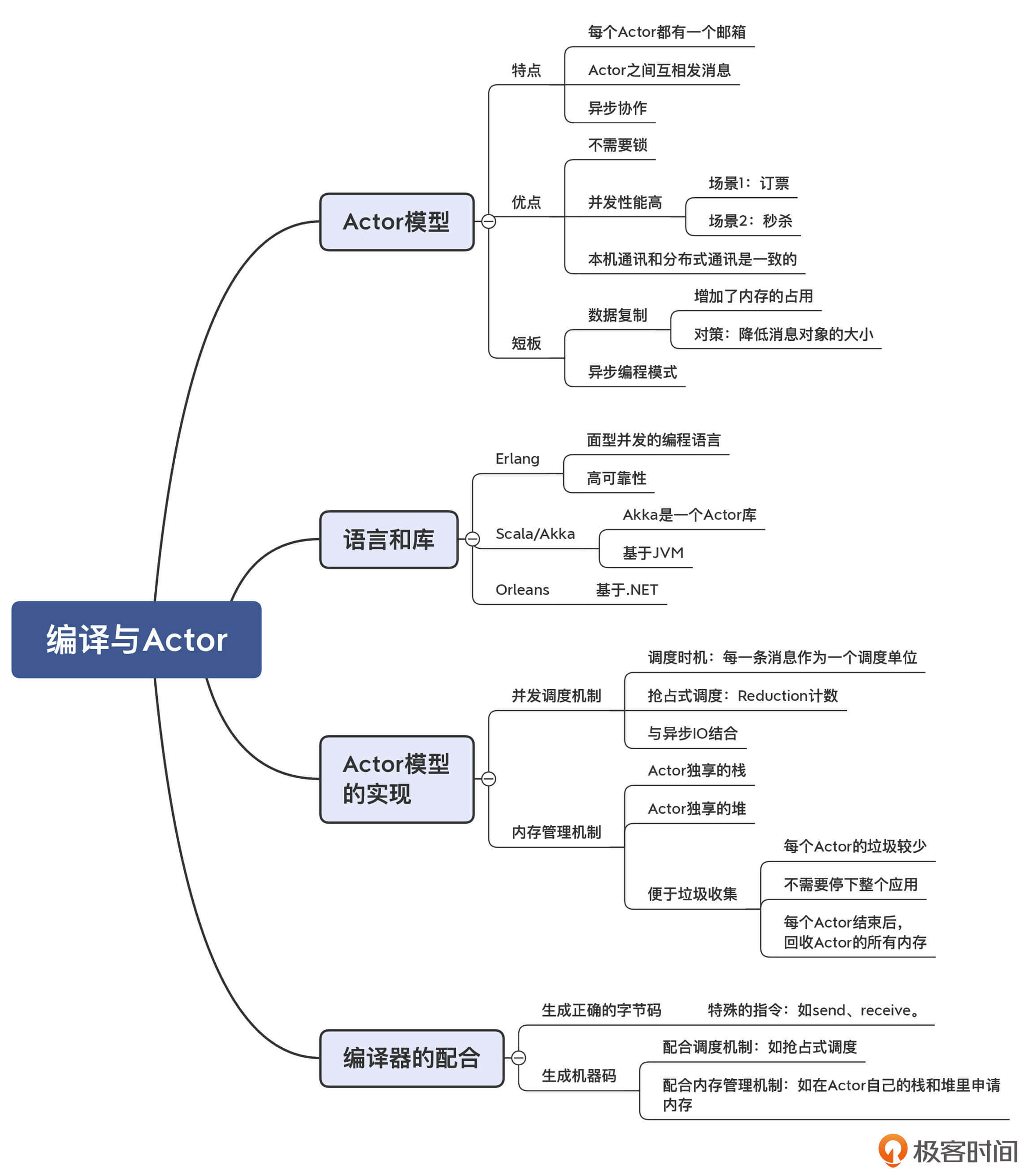 今天这一讲,我们就从这几个问题出发,一起学习并理解Actor模型。借此,我们也可以把用编译技术支持不同的并发模型的机制,理解得更深刻。