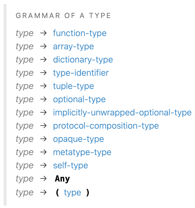 另外,Swift语言的文档对类型的定义也比较清楚。它以产生式的方式列出了type的语法定义。根据该语法,类型可以是函数类型、数组类型、字典类型、元组类型等等,这些都是类型。