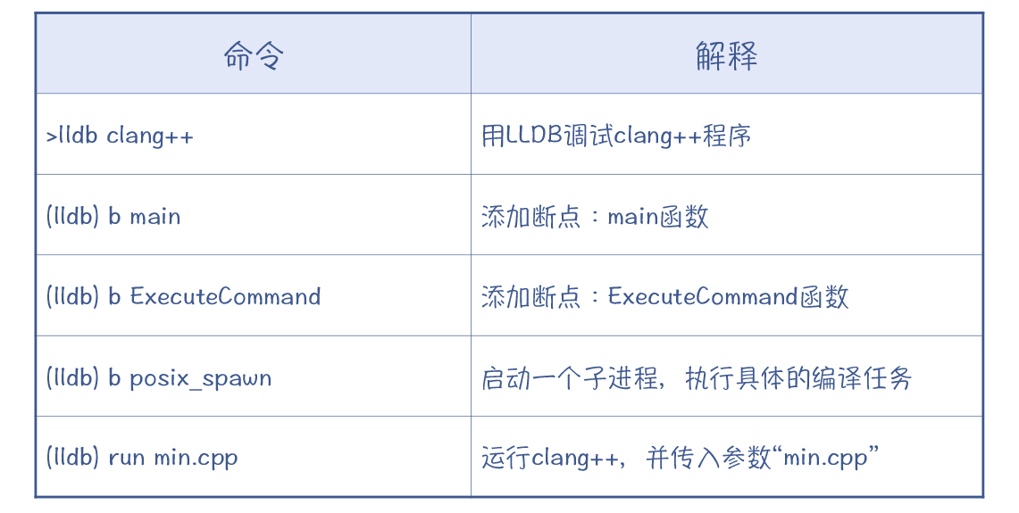 要揭示编译过程,最快的方法是用调试器来跟踪程序的执行过程。最常用的调试器就是LLDB和GDB。这里我使用的是LLDB,你可以参考我给出的命令来设置断点、调试程序。