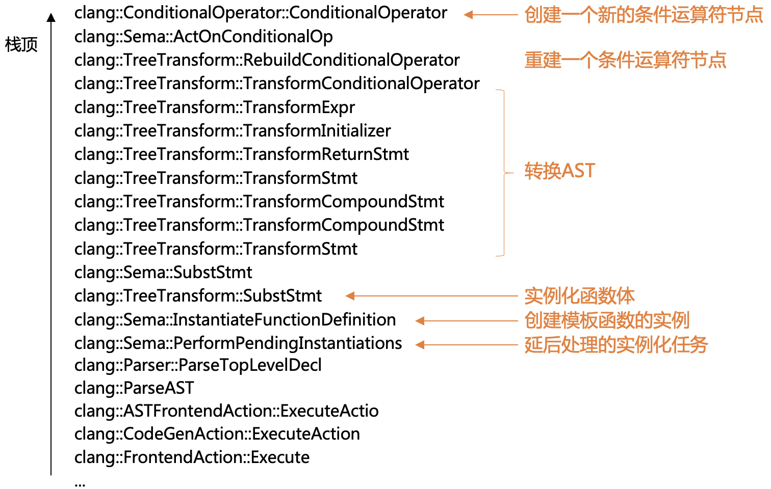 从前面函数模板的AST中你已经知道,函数体中包含了一个ConditionalOperator节点。所以,我们可以故技重施,在ConditionalOperator()上设置断点来等着。因为编译器要实例化函数体,就一定会新创建一个ConditionalOperator节点。