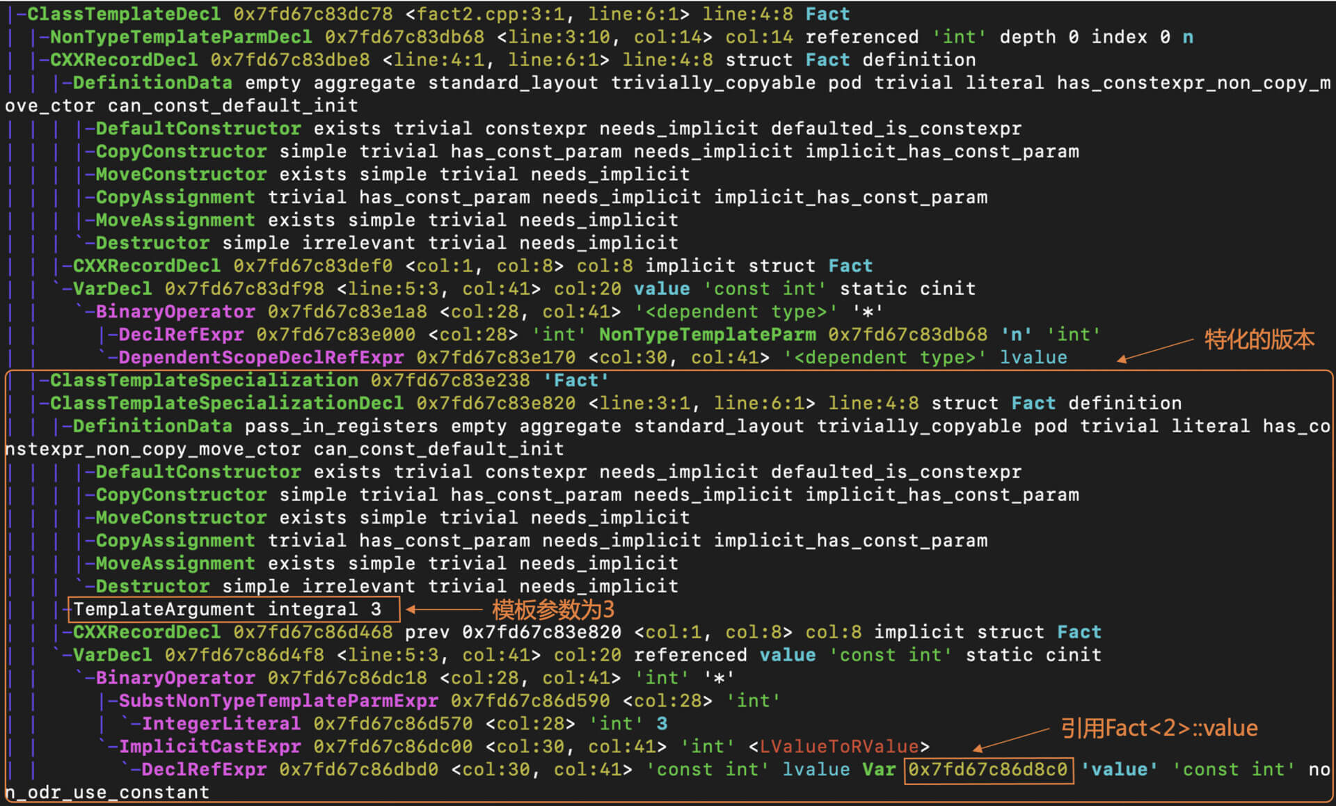 接着,是针对这个模板做的特化。由于在main函数中引用了Fact<3>::value,所以编译器必须把Fact<3>特化。特化的结果,是生成了一棵ClassTemplateSpecializationDecl子树,此时模板参数为3。而这个特化版本又引用了Fact<2>::value。