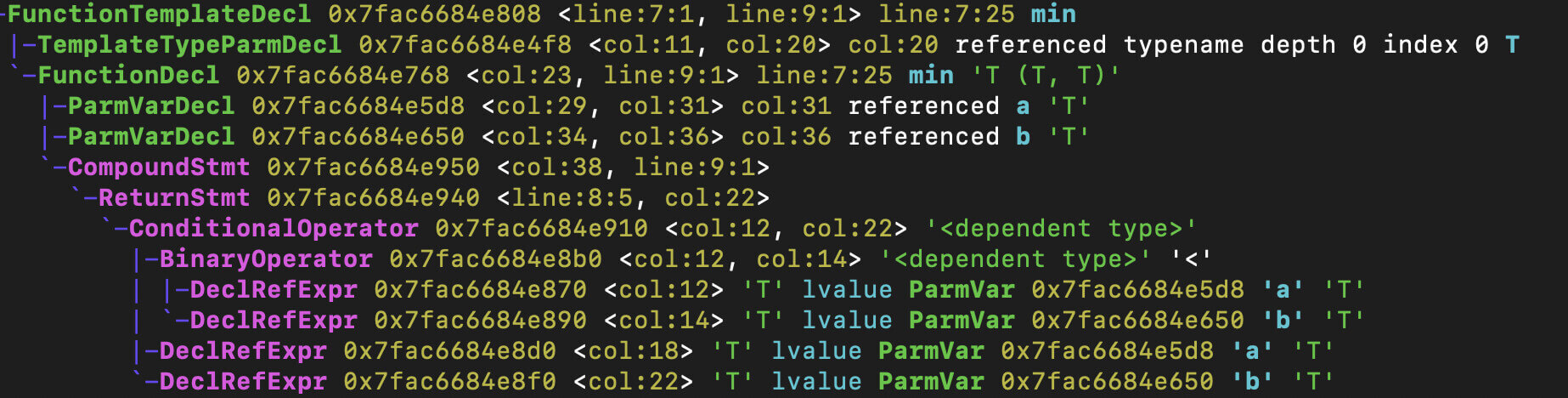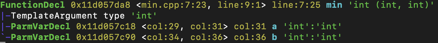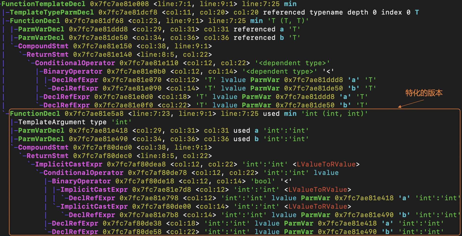 这个时候,我们再看一下它生成的AST,就会发现函数模板声明之下,增加了一个新的函数声明。这个函数的名称仍然是min,但是参数类型具体化了,是整型。