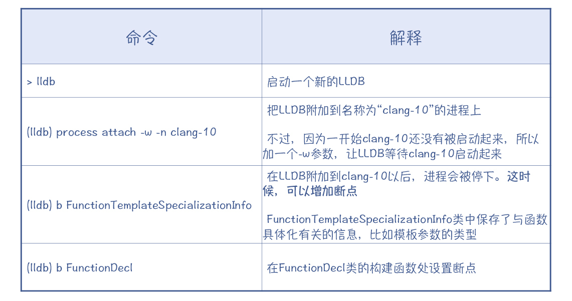 不过,在跟踪clang++执行的时候,你会发现,clang++只是一个壳,真正的编译工作不是在这个可执行文件里完成的。实际上,clang++启动了一个子进程来完成编译工作,这个子进程执行的是clang-10。所以,你需要另外启动一个LLDB,来调试新启动的进程。