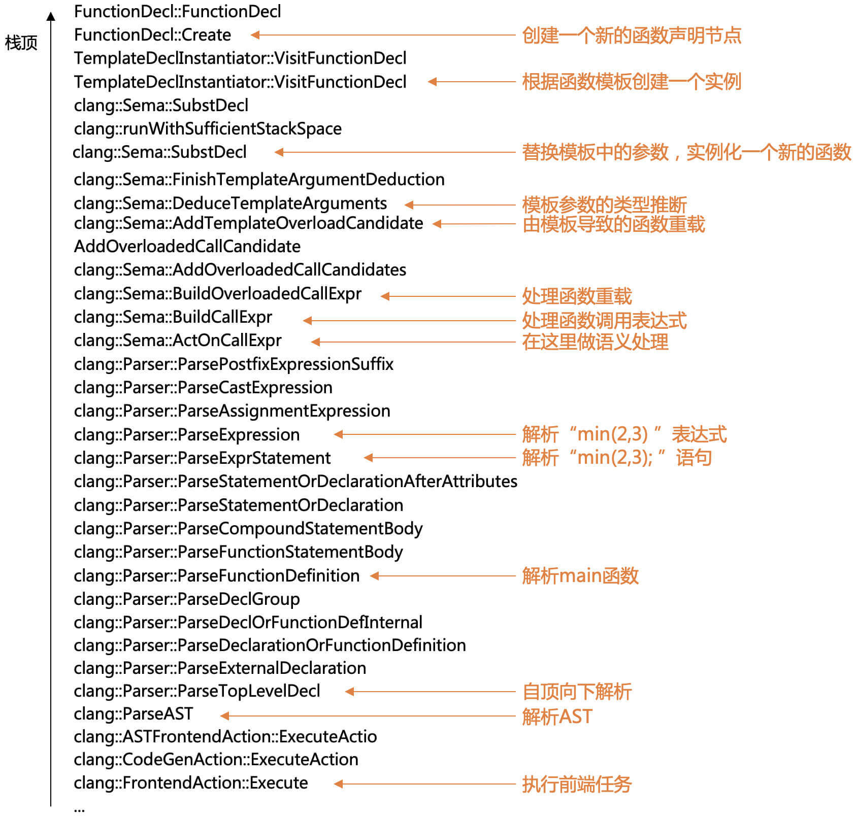 那怎么查看调用过程呢?当clang-10在FunctionDecl断点停下以后,你可以用“bt”命令打印出调用栈。我把这个调用栈整理了一下,并加了注释,你可以很容易看清楚编译器的运行过程: