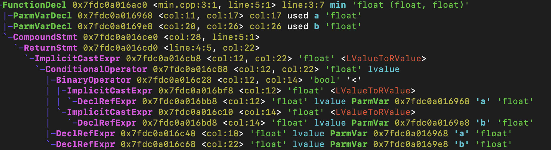 下图中展示的是min函数对应的AST。你能发现AST节点的命名都很直观,一下子就能看明白每个节点的含义。其中,函数声明的节点是FunctionDecl,也就是Function Declaration的缩写。