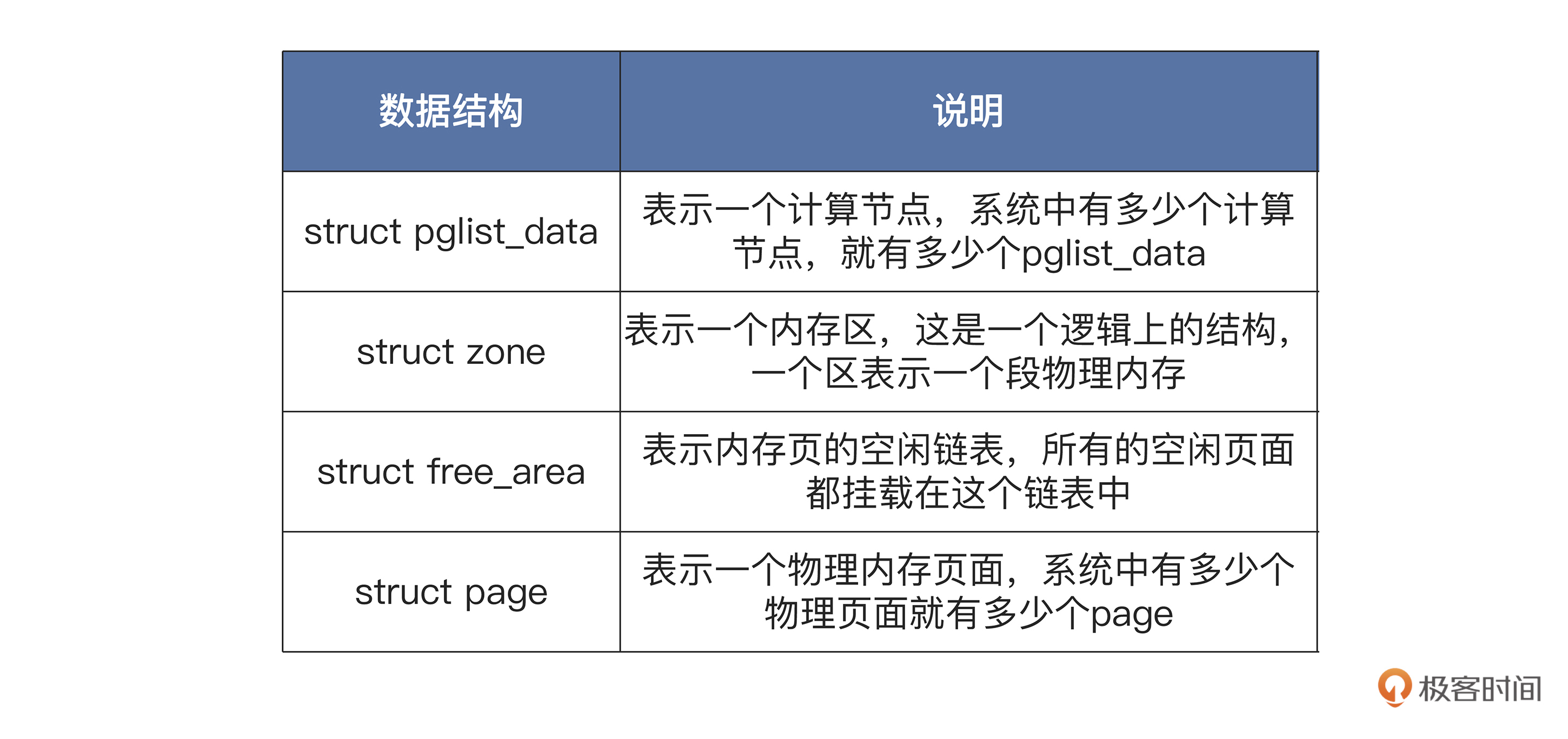 上面的NUMA体系架构上,节点内部的内存和节点之间的内存,其访问速度是不一样的,这无疑是提升了Linux的内存管理的复杂度。因此,Linux用了大量的数据结构来表示计算节点,内存、内存页面,以及它们之间的关系。
