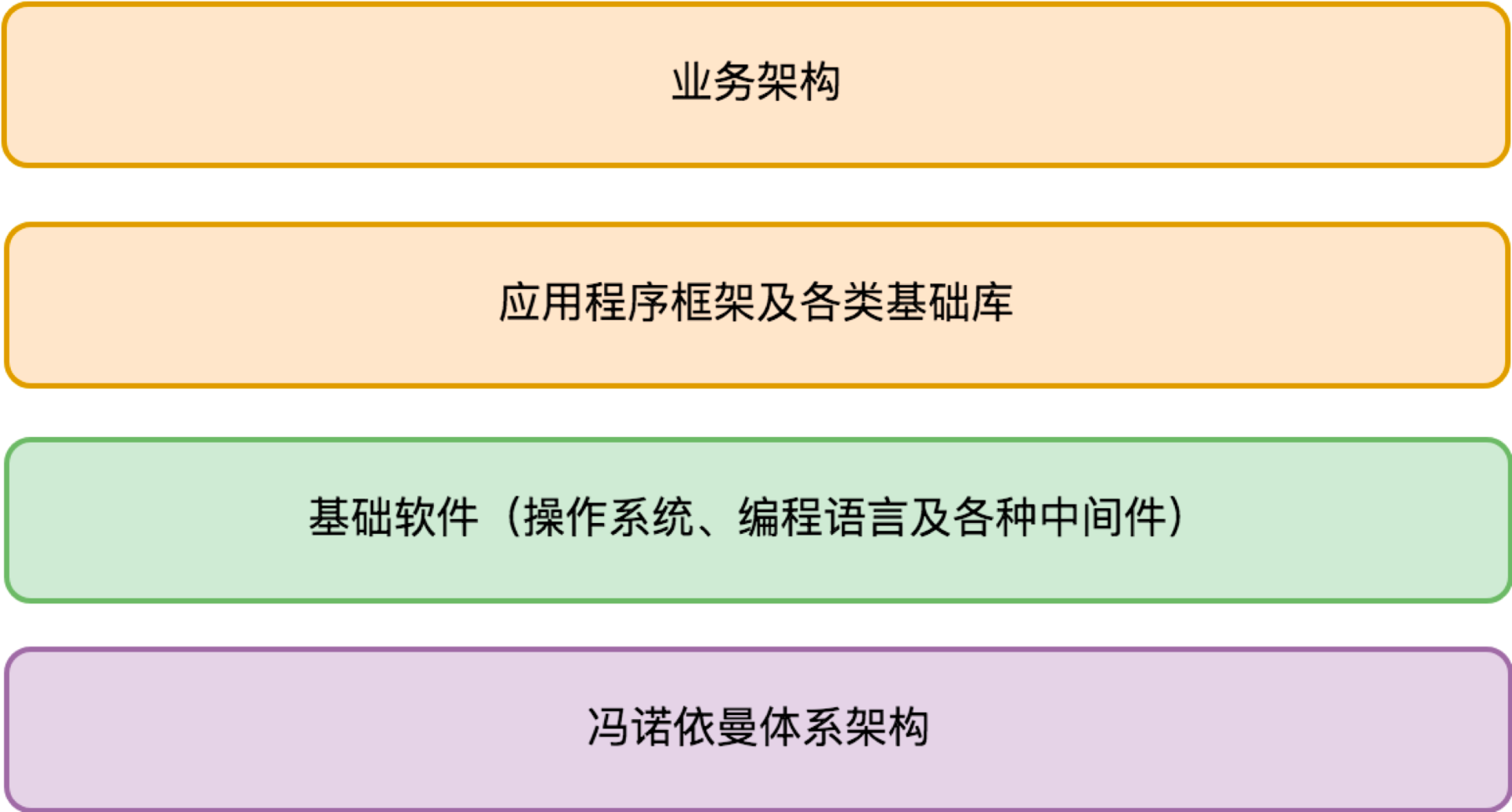 图中淡紫色是硬件层次的依赖,是我们程序工作的物理基础。淡绿色的是软件层次的依赖,是我们程序工作的生态环境。桔色的是库或源代码层次的依赖,是我们程序本身的组成部分。细分的话它又可以分两部分:一部分是业务无关的框架和基础库,还有一部分是业务架构。