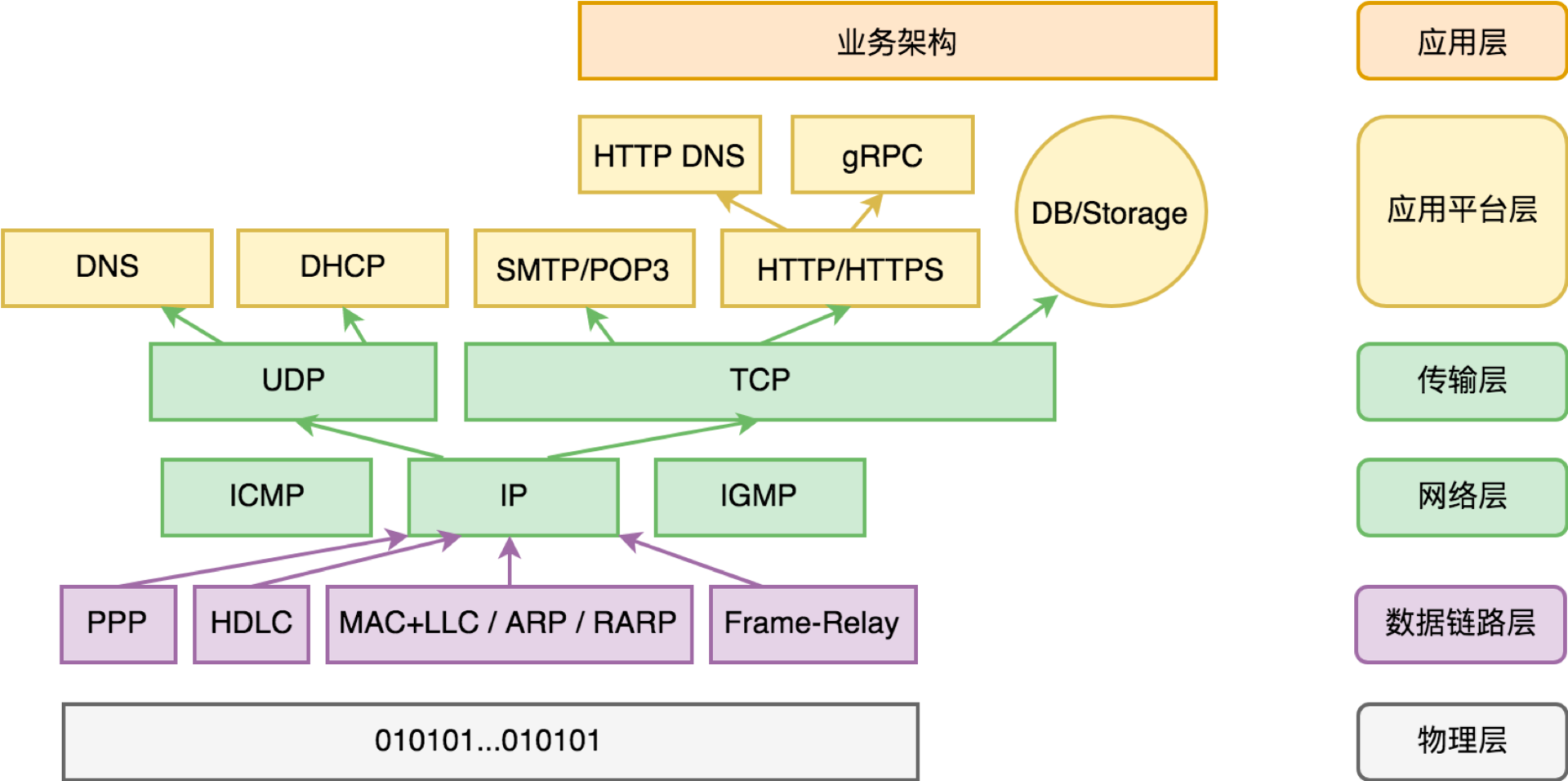 上图所示的网络世界所构建的庞大基础平台,从物理层 -> 数据链路层 -> 网络层 -> 传输层 -> 应用平台层,也都是我们业务架构的依赖点。选择自定义网络协议,基于 gRPC,还是基于 HTTP 提供 RESTful API ?这是架构师需要做出的决策之一。