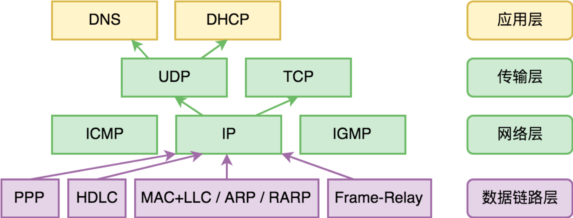在上一讲 “[14 | IP 网络:连接世界的桥梁]” 中我们介绍了 IP 网络的工作原理。我们还画了一幅与数据传输这件事本身有关的网络协议图,如下: