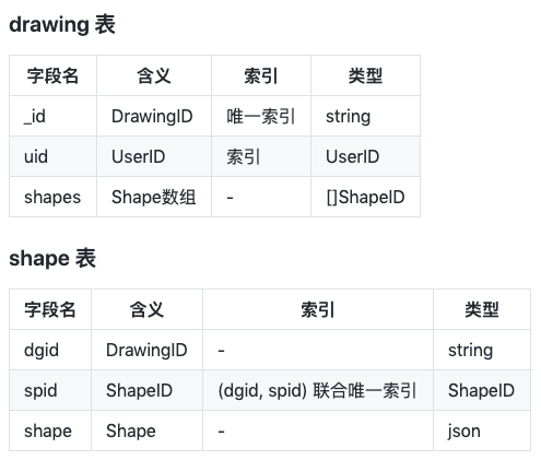 我们定义了两个表(Collection):drawing 和 shape。其中,drawing 表记录所有的 drawing,而 shape 表记录所有的 shape。具体如下: