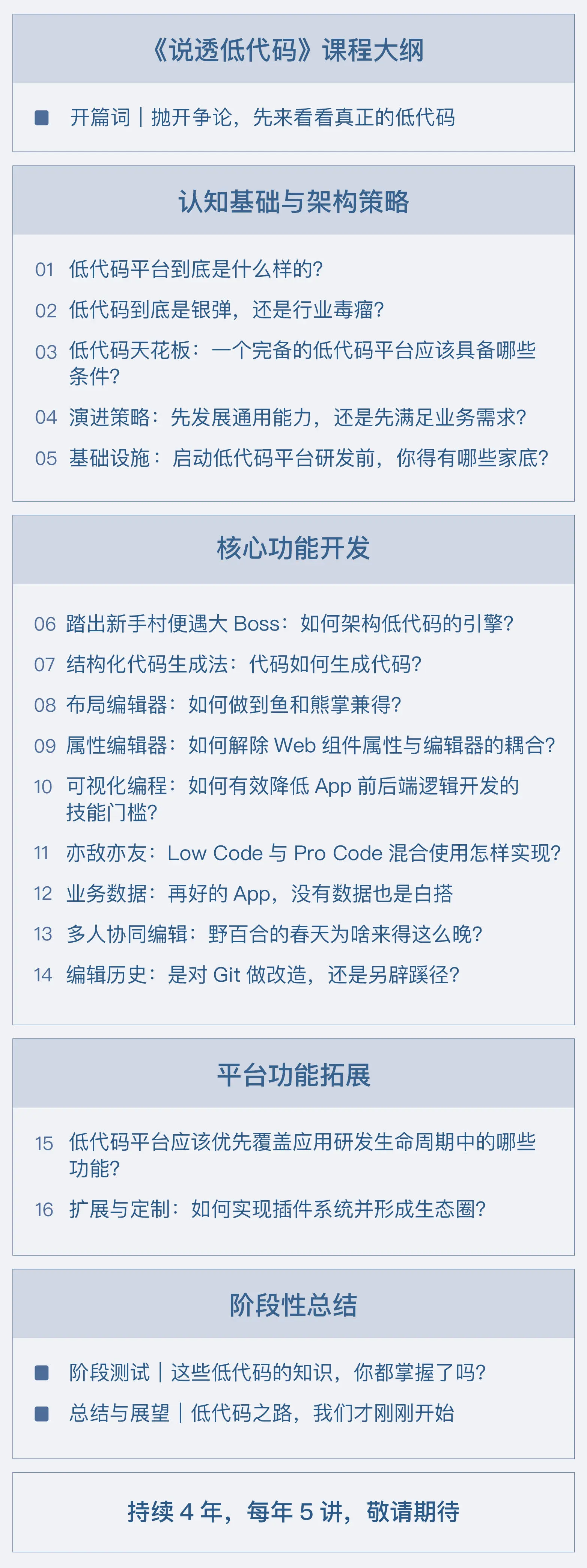到这里你可能会发现,似乎这三部分并不是这个专栏的全部。确实,这是动态更新的专栏,第一阶段更新完后的四年之内,我会以每年 5 讲的频率,继续更新,带你去看最新、最前沿的低代码技术动态。内容主要有这些方面: