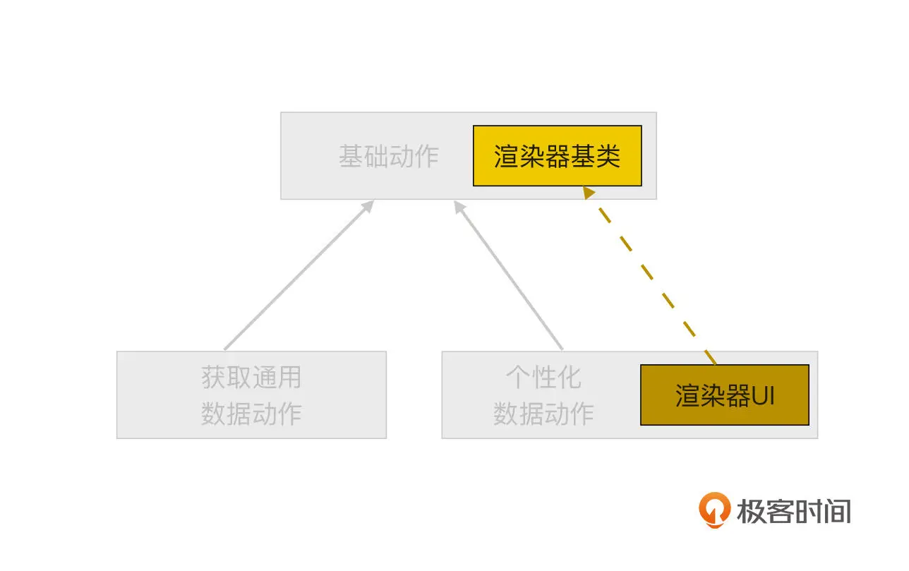 我采用的是后者,子类可以将处理 UI 的所有逻辑,都封装到动态渲染器中。并且得益于 TypeScript 特性,我还可以为各种渲染器组件提供一个父类,以减少子类开发时的难度和编码量。此时渲染器与基础动作之间会形成下图这样的关系: