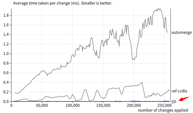 这里你要注意图中红色的箭头,Yjs 的效率非常高,几乎与横轴贴合在一起。所以应该选择哪个,就不需要我多说了吧?